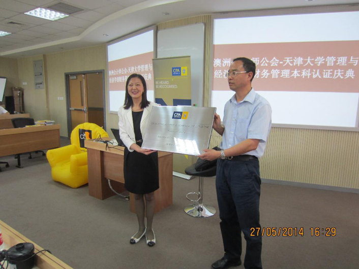 澳洲会计师公会北京代表处首席代表王瑾女士向天津大学管理与经济学部副主任杨宝臣颁授香港澳洲会计师公会认证证书