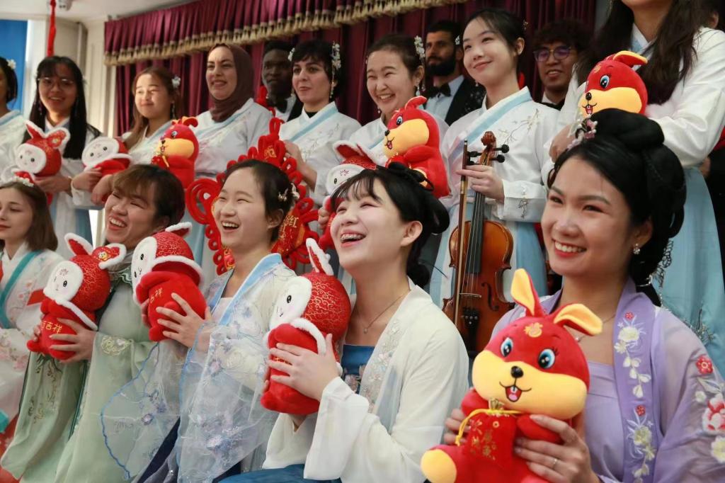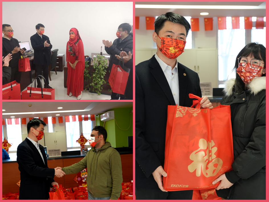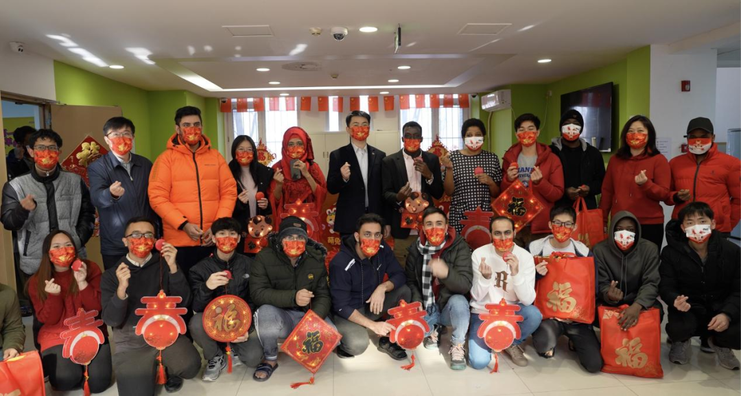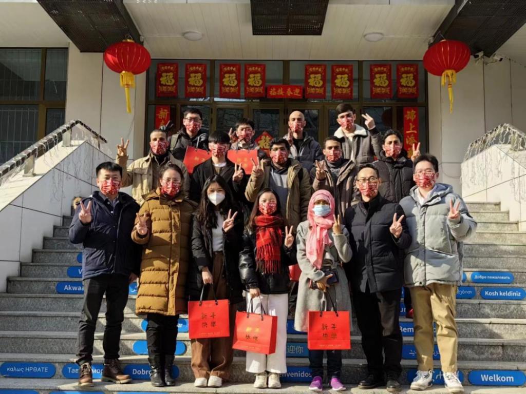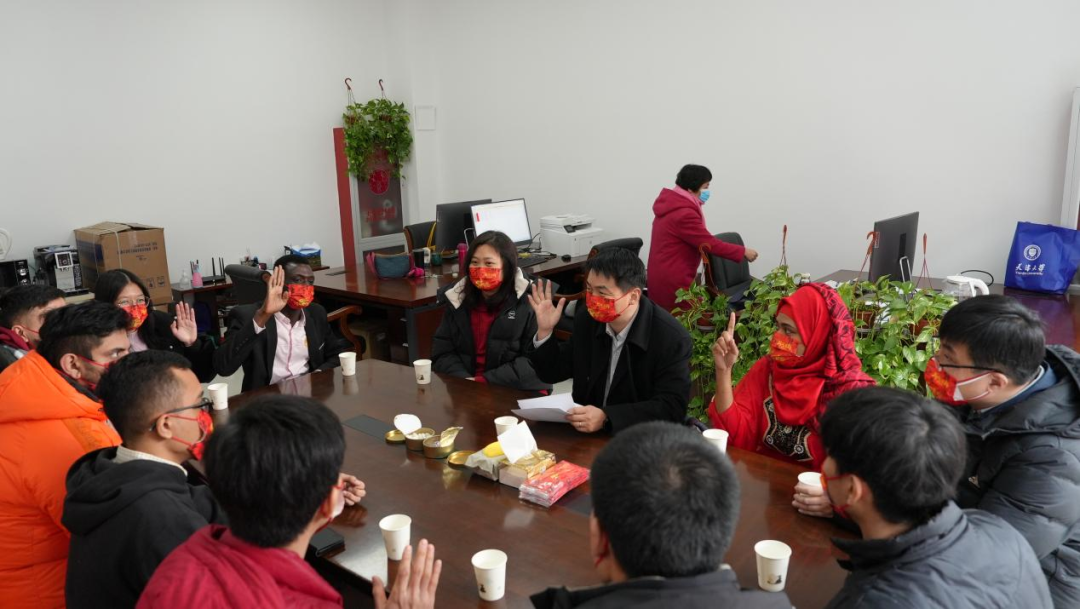 挥别壬寅虎年,喜迎癸卯兔年。1月21日上午,天津大学双校区留学生宿舍张灯结彩、年味正浓。天津大学副校长巩金龙、国际教育学院院长李锵、党委书记金旋、副院长杨小锐、林卫峰与留学生欢聚一堂,为留校学生送上学校的新春礼物与诚挚祝福,师生共话情谊、同迎新春。