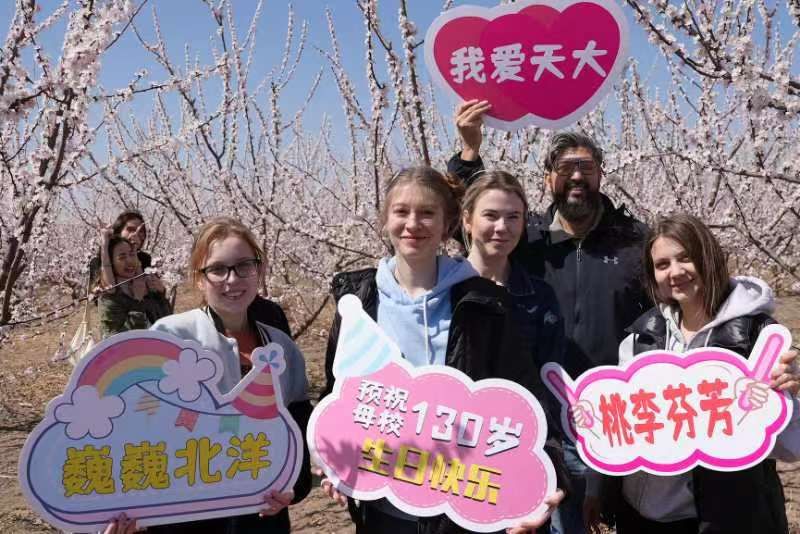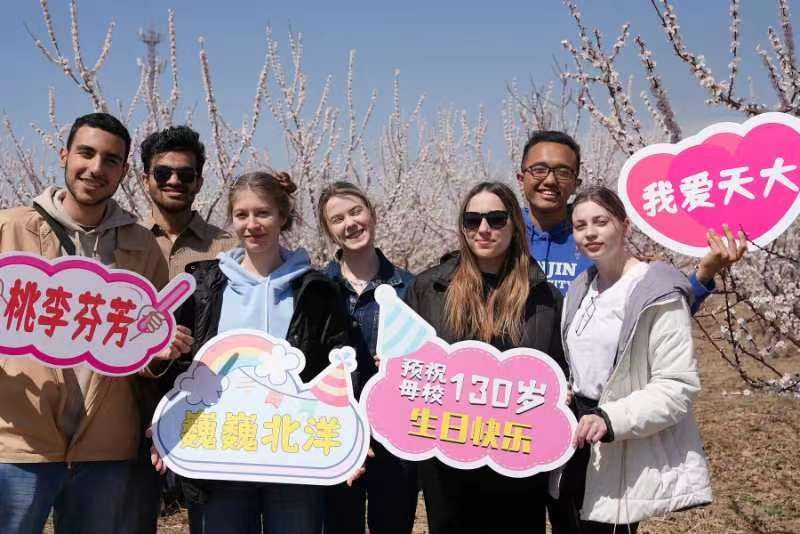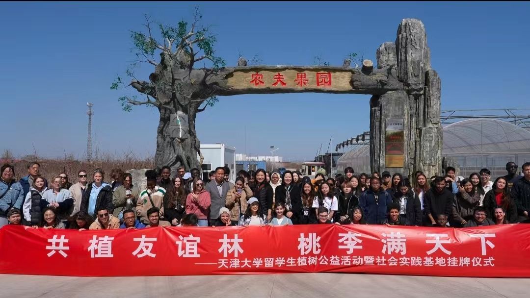当天上午,天津大学国际教育学院的师生抵达大贾庄村生态农业产业园。近百名国际学生在“学农导师”带领下参观农场,了解中国传统农耕机具,一起干农活,体验松土、剪枝等日常生产劳动,在学习中收获快乐,在劳动中学会合作。记者在现场看到,中外师生分组植树干劲火热:他们在一棵棵亲手种下的树苗上挂牌并写上自己的名字,经过一整天的劳作,建立起一片由130棵桃树组成的“天大国际友谊林”,将自己对中国、对母校的热爱融入这片“花堤蔼蔼”,预祝天津大学明年建校130周年生日快乐。