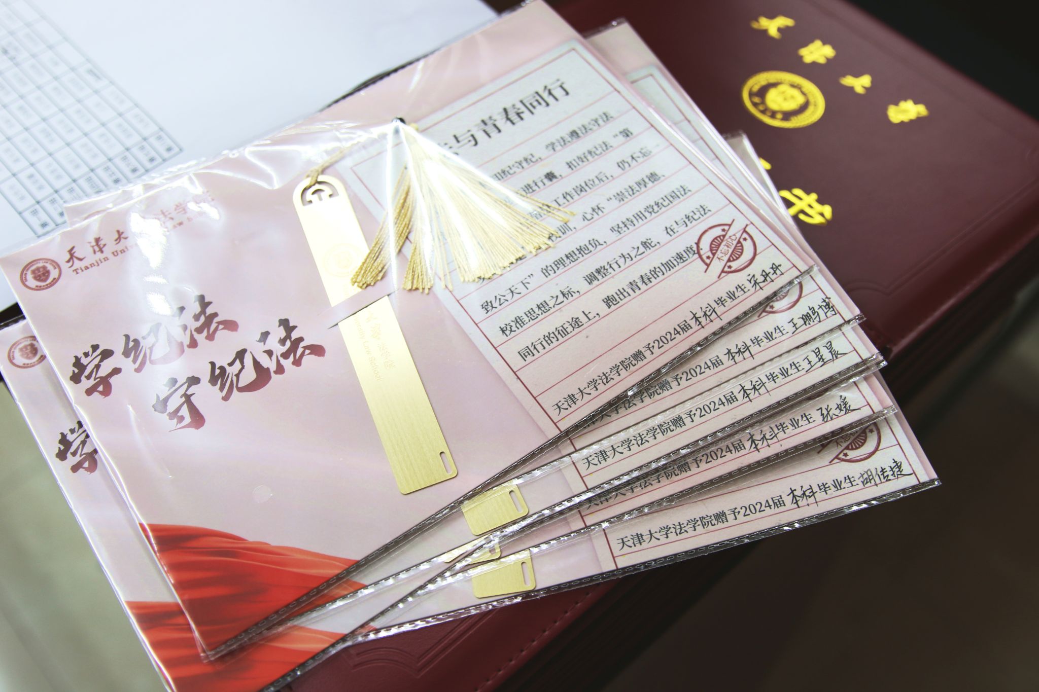 临别之际,为毕业生赠送各具特色的毕业礼物是天津大学的传统。法学院外,自动化学院为毕业生准备了写满四年课程的文件袋等作为伴手礼,寓意“知识累积与传承”;精仪学院为2024届本科毕业生定制了木质黄铜签字笔及“一路前行”定制书签尺作为伴手礼,希望同学们谨记“实事求是、精益求精”的为人治学准则;建筑工程学院则为毕业生准备了扉页印有“移山填海,建功立业”口号以及师长们毕业寄语的文创本作为伴手礼;经管学部组织毕业生簪花装饰学士帽,寓意毕业生未来“一路生花”……