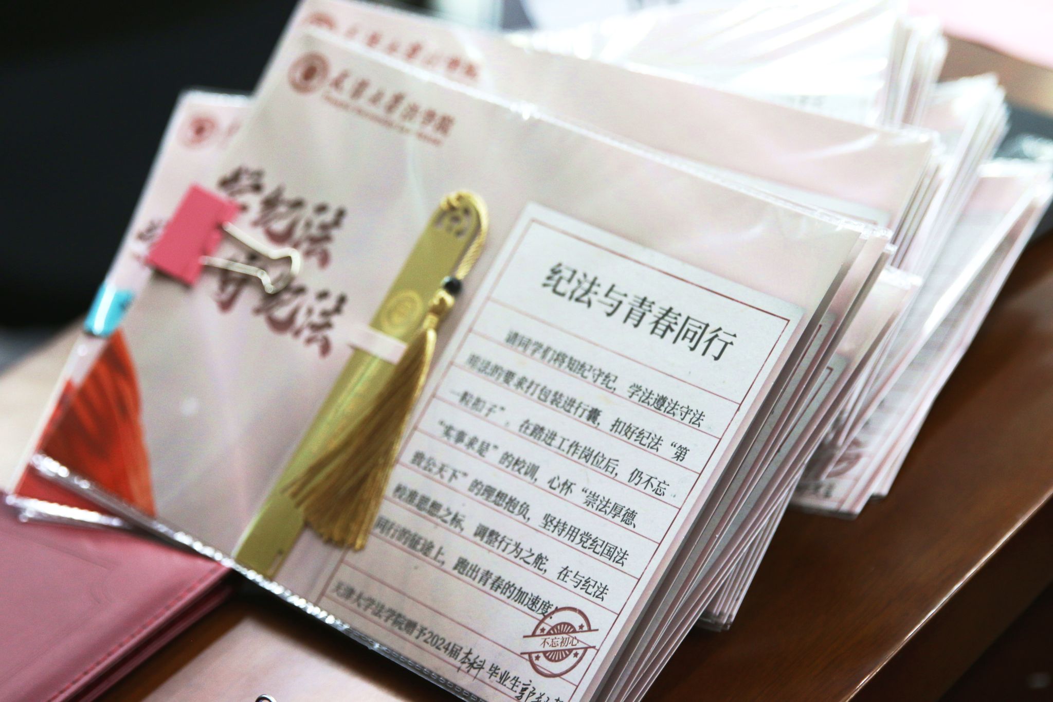 “心有所畏,方能行有所止”“初心如磐、使命如炬”“我心昭昭、不畏迢迢”“不断掸去思想上的灰尘”“不忘初心、方得始终”“心中有尺、行中有度”……今年的毕业季恰逢党纪学习教育期间,天津大学法学院特别为每位毕业生定制了镌刻有他们座右铭的“戒尺”书签作为毕业礼物。法学院院长孙佑海教授也嘱咐各位毕业生扣好人生“第一粒扣子”,养成廉洁奉公的习惯。在将来的工作中,无论从事何种工作,都要增强纪律意识、规矩意识,做社会风气的引领者、营造者、维护者,希望大家不忘在学校玉壶冰一样的初心。