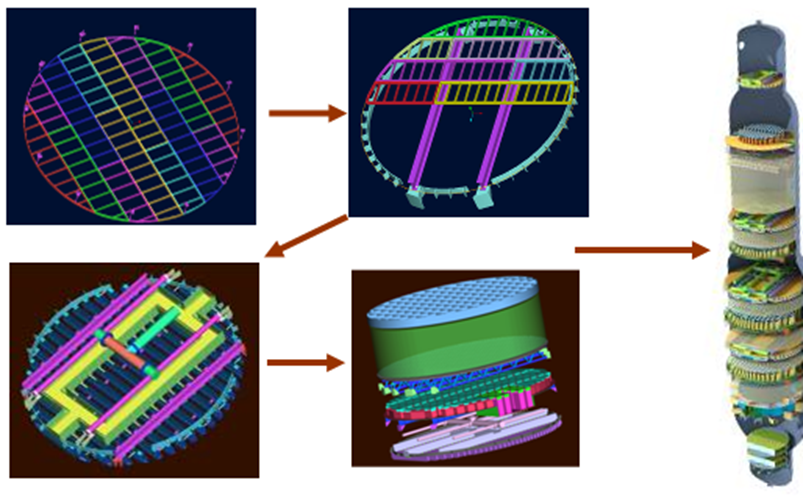 从本质上来说,蒸馏过程在塔板和填料上属于气液两相流动传热传质过程,在气体分布、液体分布、塔内气液流动等存在大量多相流体力学问题,特别是对于一些在非常规条件下操作的塔器(如高温、高压、易燃、易爆等)因条件苛刻,实验模拟难度很大。为了克服这一难题,李鑫钢教授带领团队成员创造性地应用现代信息技术、三维图形技术、过程分析与优化方法,形成多组元复杂蒸馏过程多相流体系的应用模型,建立了大型蒸馏过程设计、诊断的工程学新方法,并成功应用于大型炼油减压、乙烯急冷装置的研究开发和工程设计中,建立了大型蒸馏过程设计的工程学新方法。此外,首次将三维结构可视化、流体流态可视化和内件形变可视化技术用于蒸馏装置内部构件的优化与设计中,实现了蒸馏过程整体设计水平的提升。开发的高效低阻力的塔填料,高性能气体、液体分布器,大型微变形支撑装置等多项专利技术和产品,解决了炼油常减压装置大型化带来的流体分布不均、设备阻力大、能耗高等技术难题和长周期运转带来的装置变形、堵塞等工程实际难题。针对大型乙烯装置汽油急冷装置,开发出塔盘低液面梯度、气液均布、抗堵塞等多项关键新技术,研制了高效三溢流塔盘、折返流气体分布器等多项新产品,解决了长期以来束缚我国乙烯急冷装置大型化和长周期运行的重要难题。开发的炼油减压蒸馏装置,多次创造国内最大直径塔器的研制记录(13.7米),研究成果获国家科学技术进步二等奖,乙烯急冷装置也突破了国外对我国大型乙烯急冷技术的壁垒,工程化成果覆盖了我国新建大型乙烯急冷装置的60%,研究成果获教育部科学技术进步二等奖。