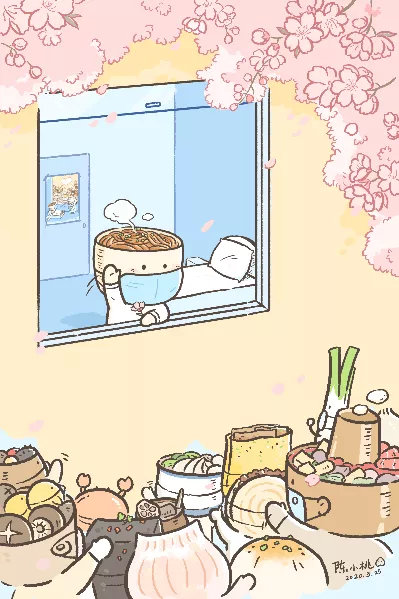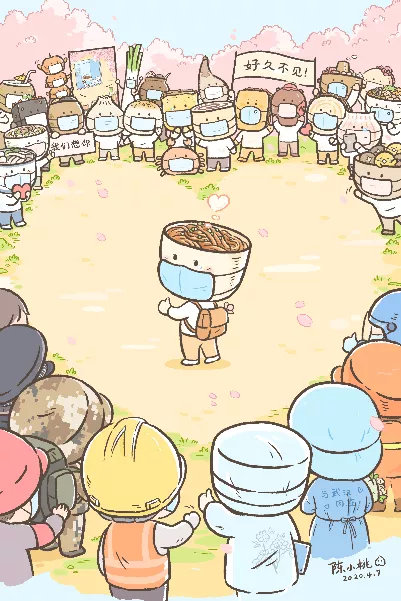 今年春节,举国上下为抗击新型冠状病毒感染的肺炎,都在以最特殊的方式携手应对。看到身边的人们或紧张或焦虑,想到奋战在一线的医护等工作人员的辛劳,粉丝和朋友们纷纷给陈小桃建议,让她赶紧出手,画一些暖心的作品,给大家提提气。“开始的时候看到有官方媒体发图,用各种美食照片给武汉热干面加油,给了我一些灵感,想到是不是可以把这种加油的场面,用漫画的形式表现出来。”