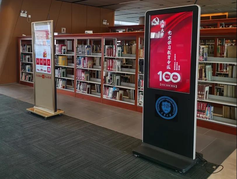 为落实党史学习教育要求,天津大学党委组织部、党委宣传部和图书馆联合开设“党史学习教育专区”,通过举办“读四史峥嵘展百年风华”主题书展、开设“百年党史百本书”专题网页、配置党史学习歌德电子阅读机、设立党建研究厢等方式打造线上线下沉浸式、立体化的党史学习平台,为党员干部师生深入学习党史提供资源、场所、服务,营造浓郁的阅读氛围。