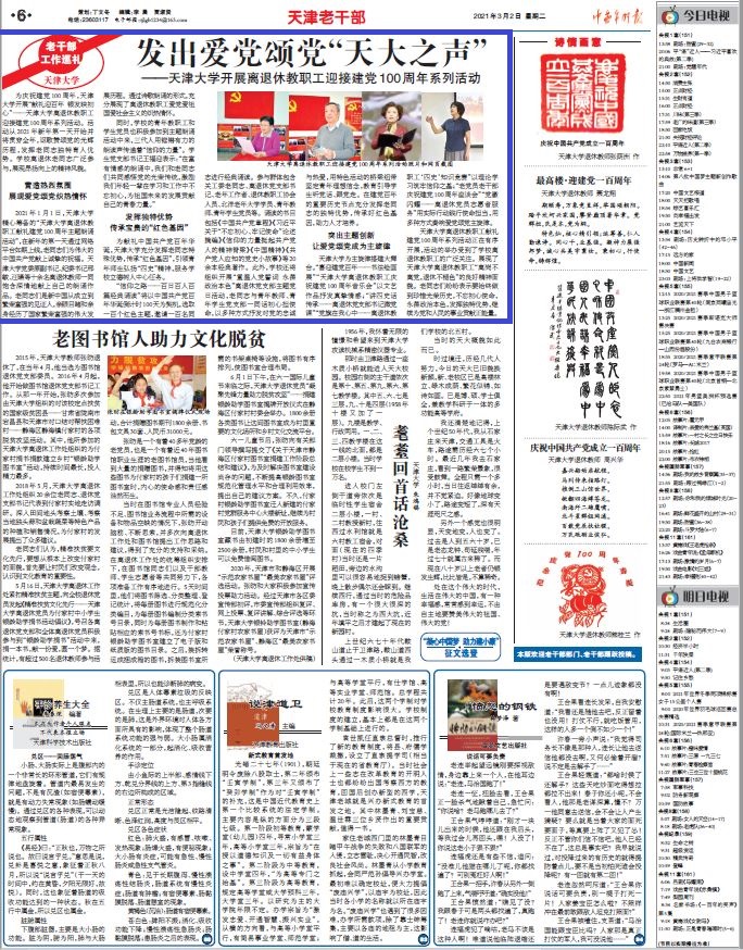 为庆祝建党100 周年,天津大学开展“献礼迎百年银发映初心”——天津大学离退休教职工迎接建党100 周年系列活动。活动从2021 年新年第一天开始并将贯穿全年,讴歌赞颂党的光辉历程,发挥老同志独特育人优势。学校离退休老同志广泛参与,展现昂扬向上的精神风貌。