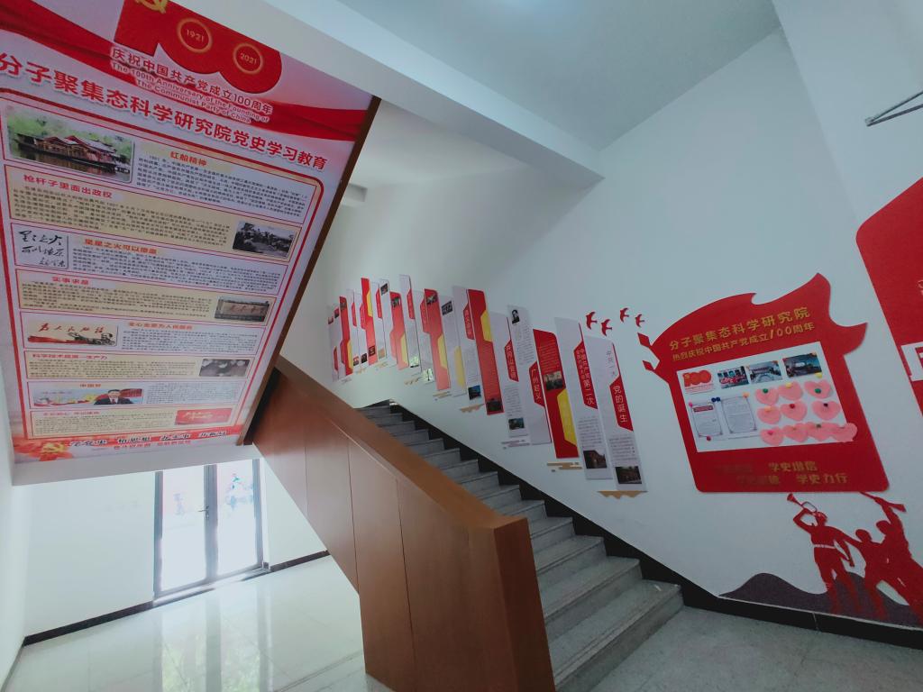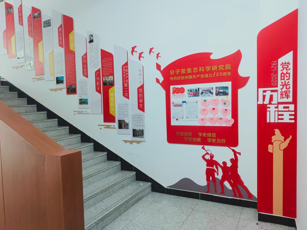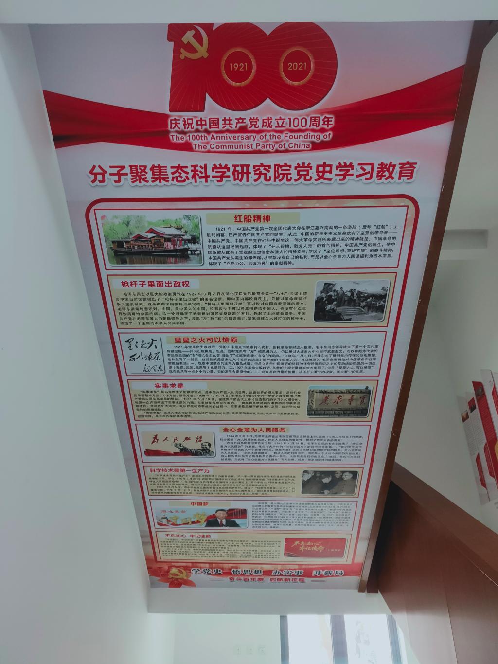本站讯 为了深入开展党史学习教育活动,宣传党的百年光辉历史,弘扬传承党史精神,在全院范围内营造良好的党史学习氛围,分子聚集态科学研究院在院内公共空间开辟党史历程宣传展示区域,引导广大师生通过在日常学习工作中耳濡目染,以史为鉴,温故知新,坚定理想信念、提高党性修养。值此中国共产党成立一百年之际,献礼党的百年华诞。