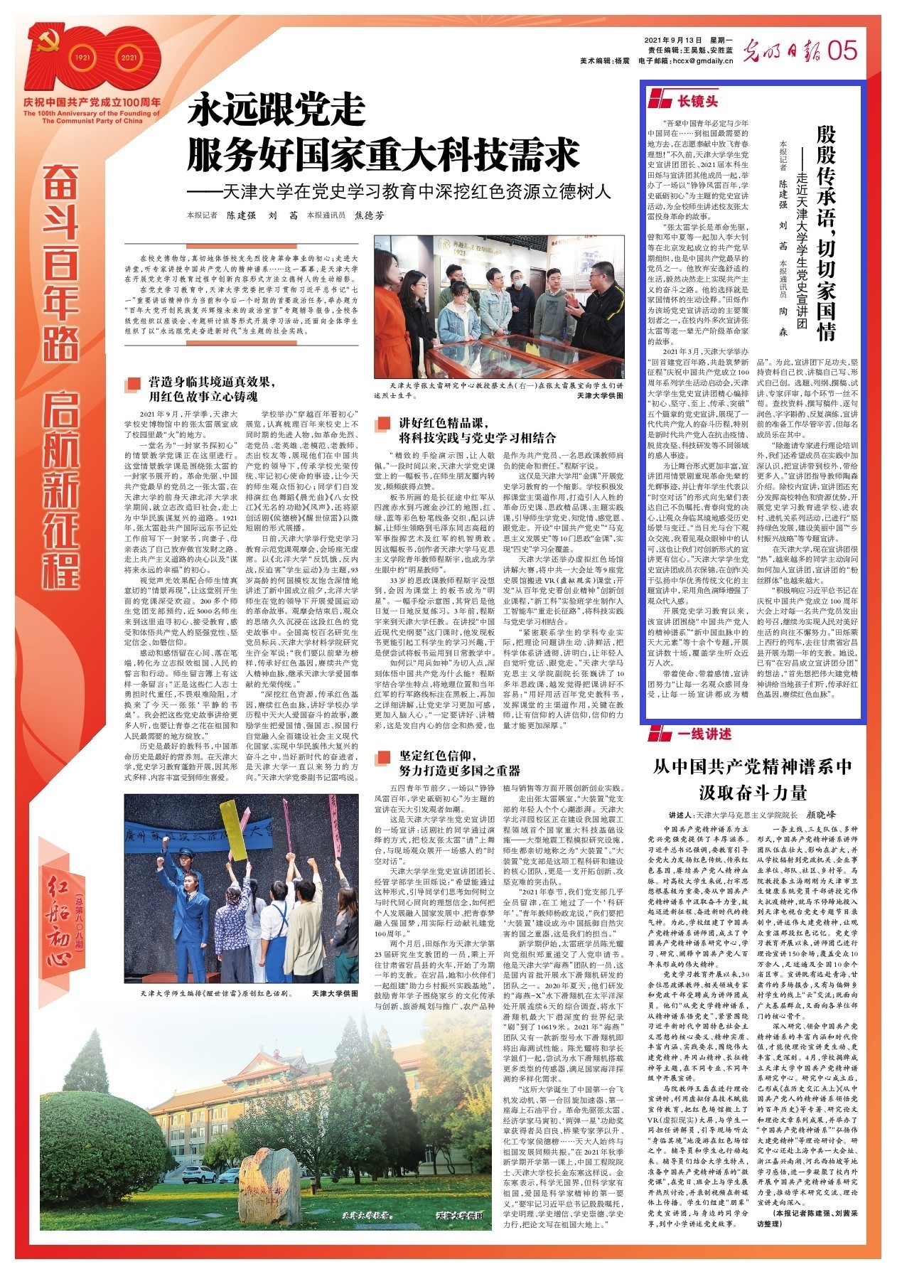 2021年3月,天津大学举办“回首建党百年路,共赴筑梦新征程”庆祝中国共产党成立100周年系列学生活动启动会,天津大学学生党史宣讲团精心编排“初心、坚守、至上、传承、突破”五个篇章的党史宣讲,展现了一代代共产党人的奋斗历程,特别是新时代共产党人在抗击疫情、脱贫攻坚、科技研发等不同领域的感人事迹。