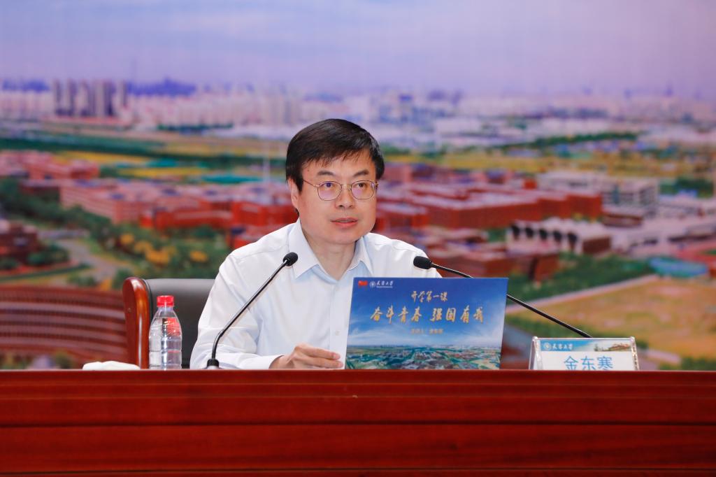 本站讯(记者 张华 摄影 郭程)9月23日,在中国共产党成立100周年之际,中国工程院院士、天津大学校长金东寒在北洋园校区求实会堂为2021级全体新生讲授开学第一课。他以“奋斗青春 强国有我”为题,与学生们讲党史国史、聊责任担当、立鸿鹄之志、话美好未来,引导同学们树立为祖国为人民永久奋斗、赤诚奉献的坚定理想,自觉肩负起实现中华民族伟大复兴的历史重任。