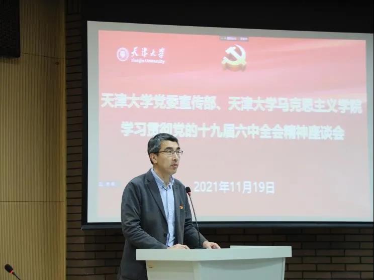 本站讯(通讯员 张鷟)为深入学习宣传党的十九届六中全会精神,推动学习宣传和研究阐释深入开展,进一步把思想和行动统一到中央部署和要求上来,11月19日,天津大学党委宣传部与马克思主义学院共同举办的学习贯彻党的十九届六中全会精神座谈会在33教学楼召开。宣传部部长吕静,副部长李嘉毅、刘一,马克思主义学院院长颜晓峰参加会议,与马克思主义学院全体师生党员和宣传部党支部全体党员共同展开学习和研讨。会议由马克思主义学院党委书记徐斌主持。与会师生围绕《中共中央关于党的百年奋斗重大成就和历史经验的决议》和习近平总书记关于《决议》的说明,交流学习体会,进行主题发言,并提出了抓实学习的目标任务和贯彻落实的工作着力重点。