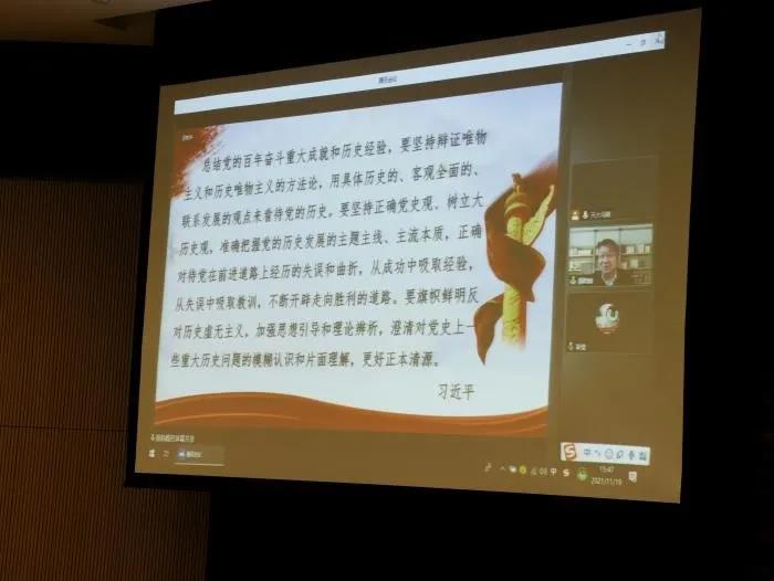 柳洲副教授以《中国共产党的百年奋斗与创新——深刻领会中国共产党百年奋斗的历史经验之坚持开拓创新》为题做了主旨发言。他从坚持开拓创新的丰富内涵、理论逻辑、历史逻辑、实践逻辑、领会践行几个方面深刻分析了中国共产党开拓创新的历史进程,认为我们党的历史就是一步不断推进开拓创新的历史,并呼吁大家以《决议》精神为指导,埋头苦干,勇毅前行。