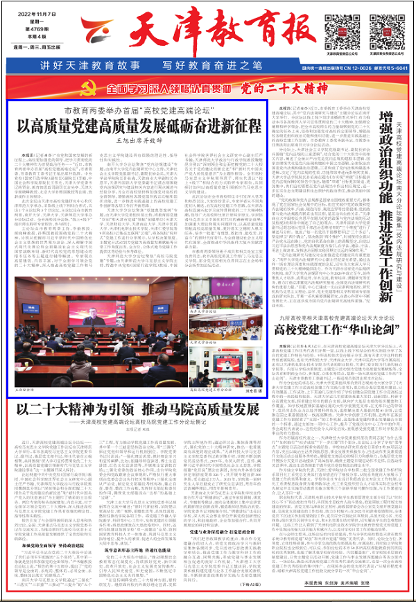 “在党和国家发展的新征程上,高校要加强党的领导,把学习贯彻党的二十大精神作为首要政治任务……”近日,市教育两委举办首届“高校党建高端论坛”,市委常委、市委教育工委书记王旭出席并致辞。中央党校(国家行政学院)副校长(副院长)李毅、中国社会科学院原院长王伟光、天津大学党委书记杨贤金、教育部思政司副司长余先亭、天津大学颜晓峰教授、北京大学孙熙国教授等出席、致辞或作主旨报告。