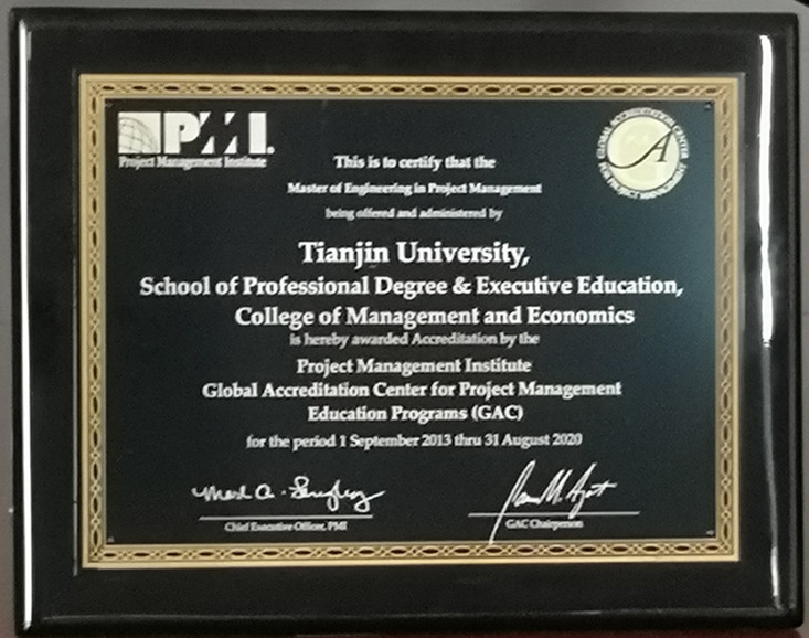 2022年,天津大学管理与经济学部工程管理专业管理学学士学位项目(Bachelor of Construction Management)通过美国项目管理协会全球项目管理学位鉴定中心(PMI-GAC)的认证,有效期至2025年8月31日。目前,国内仅8所院校的相关学位项目通过了PMI-GAC认证。天津大学工程管理专业前身为1981年成立的“基本建设管理工程专业”和1993年成立的“国际工程管理专业”,后合并为工程管理专业。专业获评“首批教育部第一类特色专业”,四次获得住建部与英国皇家特许建造学会(CIOB)的联合认证,本科及硕士课程曾获得英国皇家特许测量师学会(RICS)课程认证。2019年获首批国家级一流本科专业建设点,中国项目管理发展二十年成果奖。