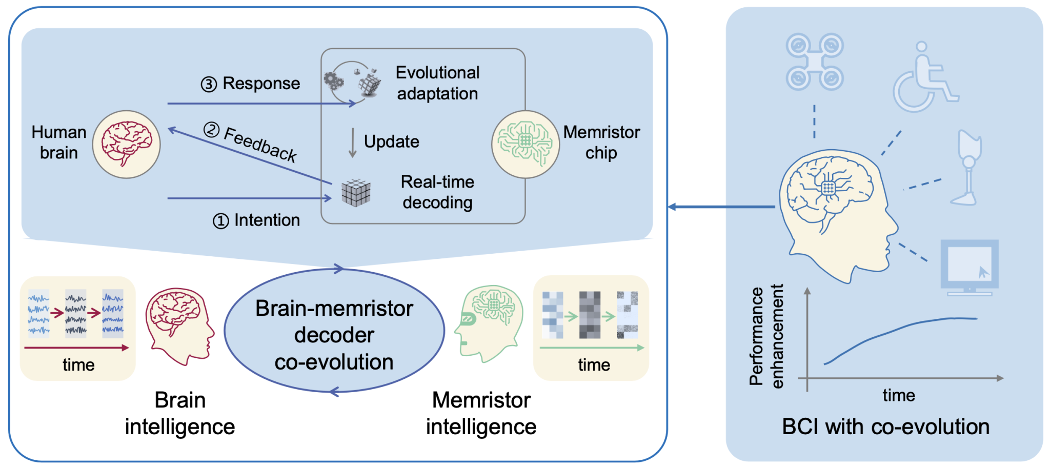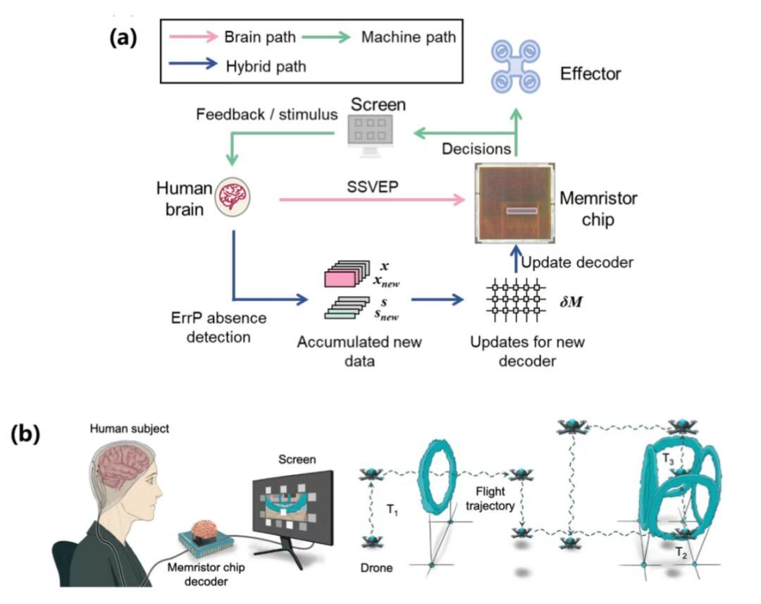 本站讯(记者 焦德芳)更高精度、更低能耗、能处理更复杂任务的脑机接口系统出现了!2月17日,天津大学脑机海河实验室和清华大学集成电路学院强强联手,开发了一款基于忆阻器神经形态器件的新型无创演进脑机接口系统。这项研究首次揭示了脑电发展与解码器演化在脑机交互过程中的协同增强效应,成功实现了人脑对无人机的高效四自由度操控。相关成果已在线发表于国际权威期刊《自然·电子》。