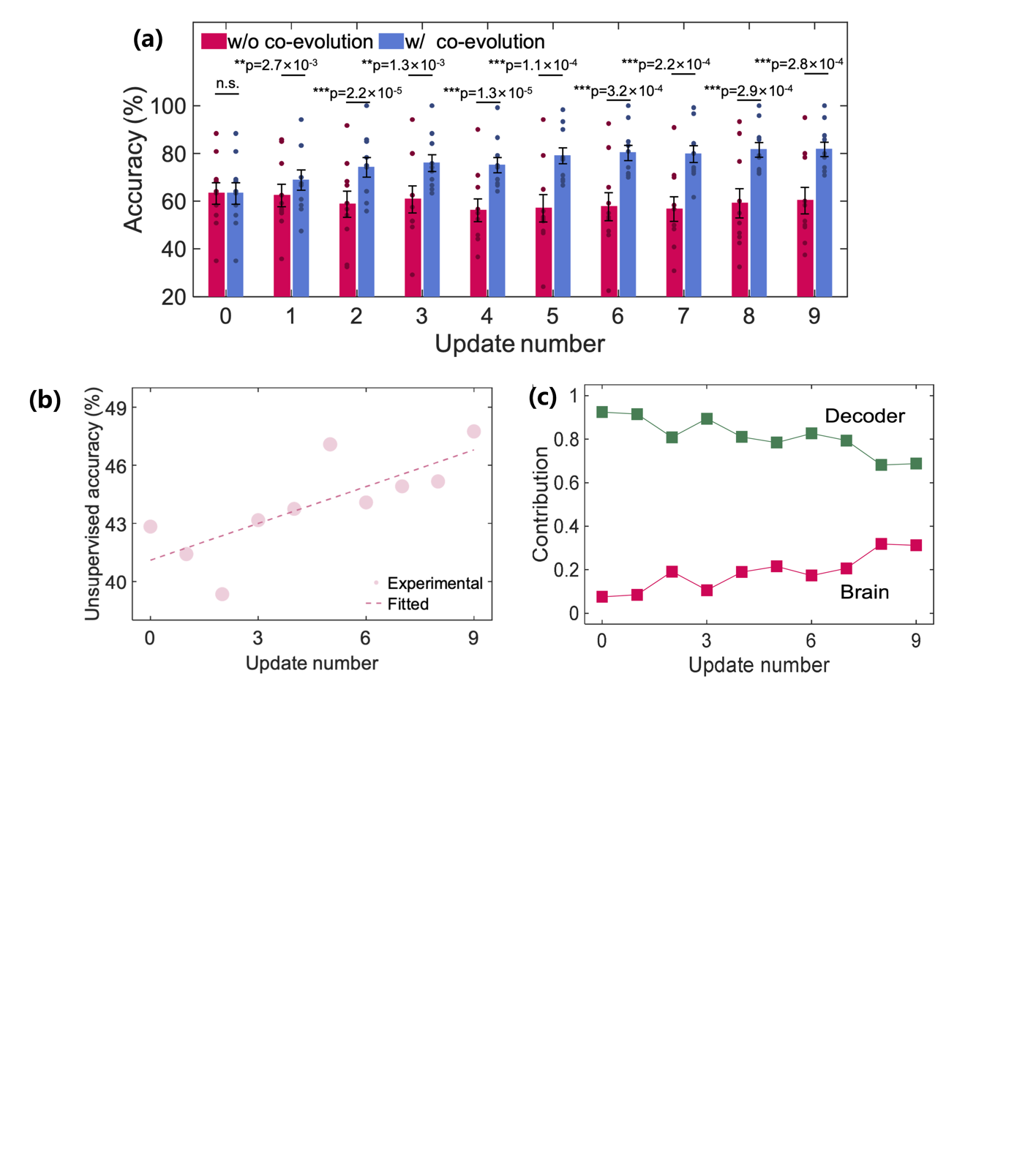 图3 (a)协同演进脑机解码正确率较初始状态提高20%;(b)任务相关脑电特征发生正向演化;(c)脑与忆阻器解码器实现互适应