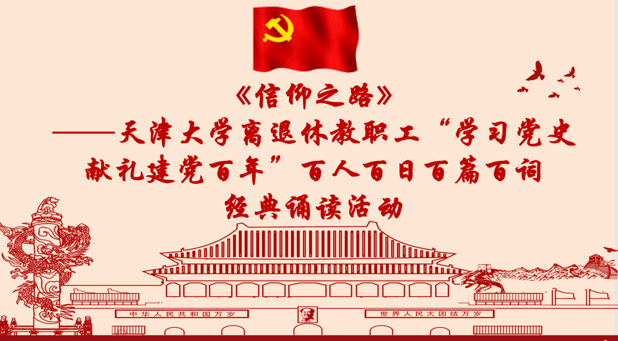 在中国共产党百年华诞之际,为重温党的光辉历程,牢记党的初心使命。坚决做到学史明理、学史增信、学史崇德、学史力行,天津大学离退休工作处特举办《信仰之路》——天津大学离退休教职工“学习党史 献礼建党百年”百人百日百篇百词经典诵读巡展。活动精选十本红色书籍,设置100个主题,邀请离退休老同志、在职教工党员、青年学生共计100人,接力诵读优秀篇章与感人段落。从建党百年倒计时100天开始,采用每天推出一篇朗读文稿的模式,以“100名朗诵者、100篇经典诵读”的形式隆重庆祝中国共产党成立100周年。