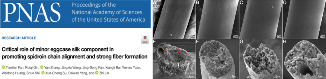 2. Fan T, Lin Z, et al. Critical role of minor eggcase silk component in promoting spidroin chain alignment and strong fiber formation.Proceedings of the National Academy of Sciences, 2021, 118(38): e2100496118.