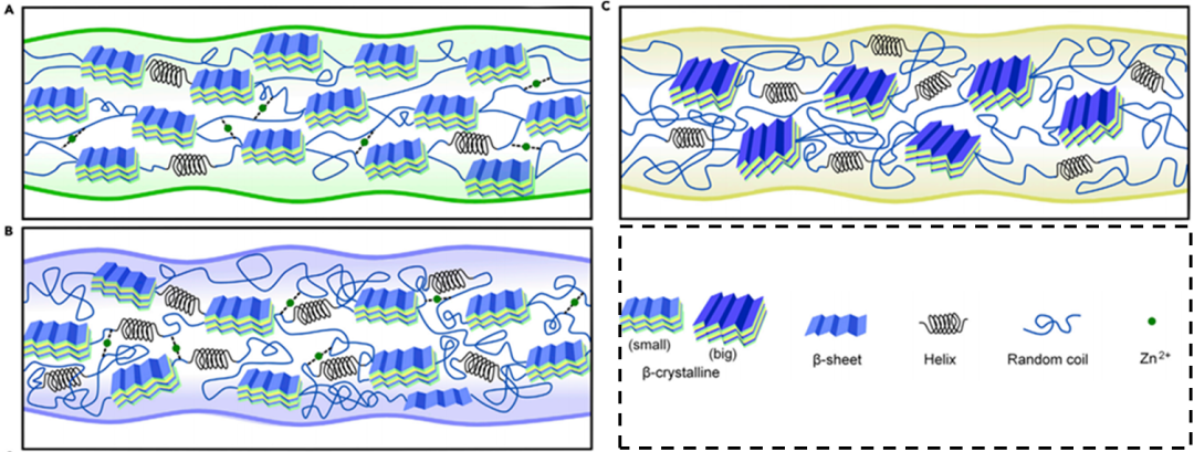 人工纺丝的具体过程如下:研究人员将浓缩的RSF-SN或RSF-Pa通过微管像挤牙膏一样挤出,并将挤出的材料迅速浸泡在含有锌离子和铁离子的溶液中,从而形成细长的纤维。由此得到的RSF-SN纤维展现出了极高的抗拉伸强度(2054±177 MPa),比脱胶的天然蚕丝(610±84 MPa)和蛛丝(1117±275 MPa)高出200 %和70 %以上,并且其平均杨氏模量为43±6 GPa,显著高于所以已知的天然微丝(<20 GPa)。人工再纺蚕丝具备优异强韧性可能主要得益于以下几个方面:(i)β-折叠的含量在50%以上,接近于天然蛛丝;(ii)具有高结晶度,内部含有类似天然蛛丝内的纳米微晶;(iii)Zn2+结合氨基酸残基起到类似交联的作用。