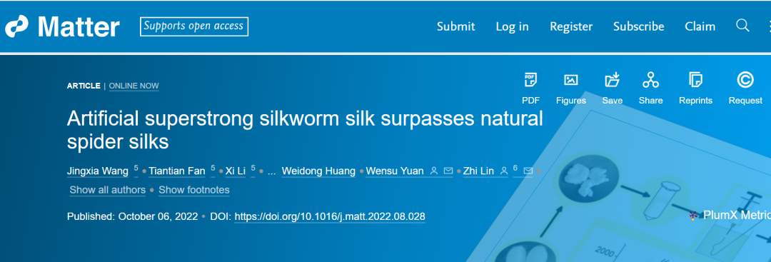 1. Wang J, Lin Z, et al. Artificial superstrong silkworm silk surpasses natural spider silks.Matter, 2022.