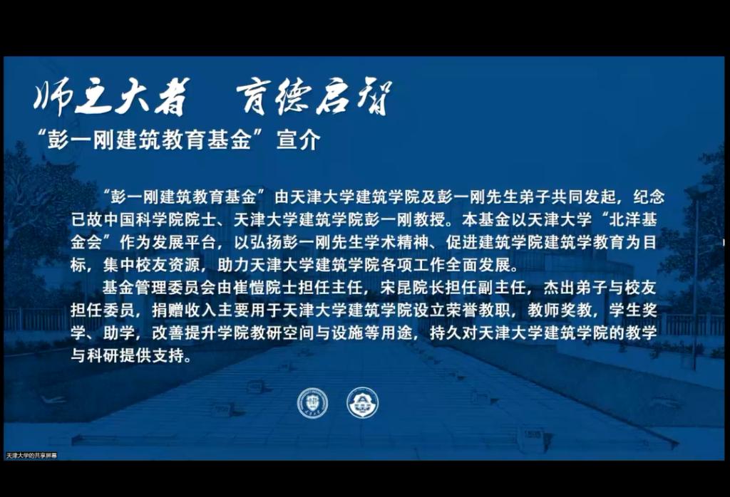 随后,“彭一刚建筑教育基金”设立仪式举行,由彭先生弟子、天津大学建筑学院副院长冯刚教授宣读了基金创立倡议书。该基金由学院及彭一刚先生弟子共同发起,以“北洋基金会”作为发展平台,以弘扬彭一刚先生学术精神、促进建筑学院建筑学教育为目标,助力学院各项工作全面发展。