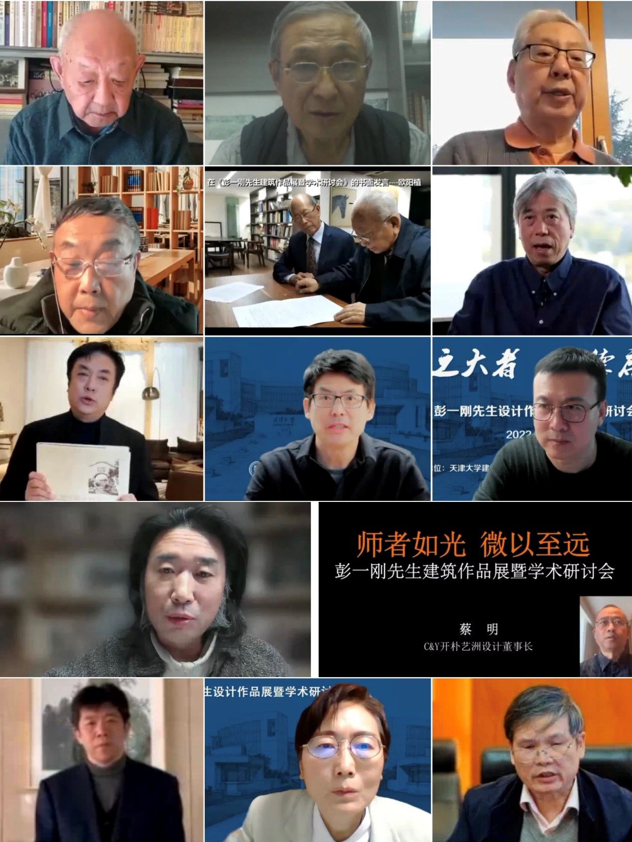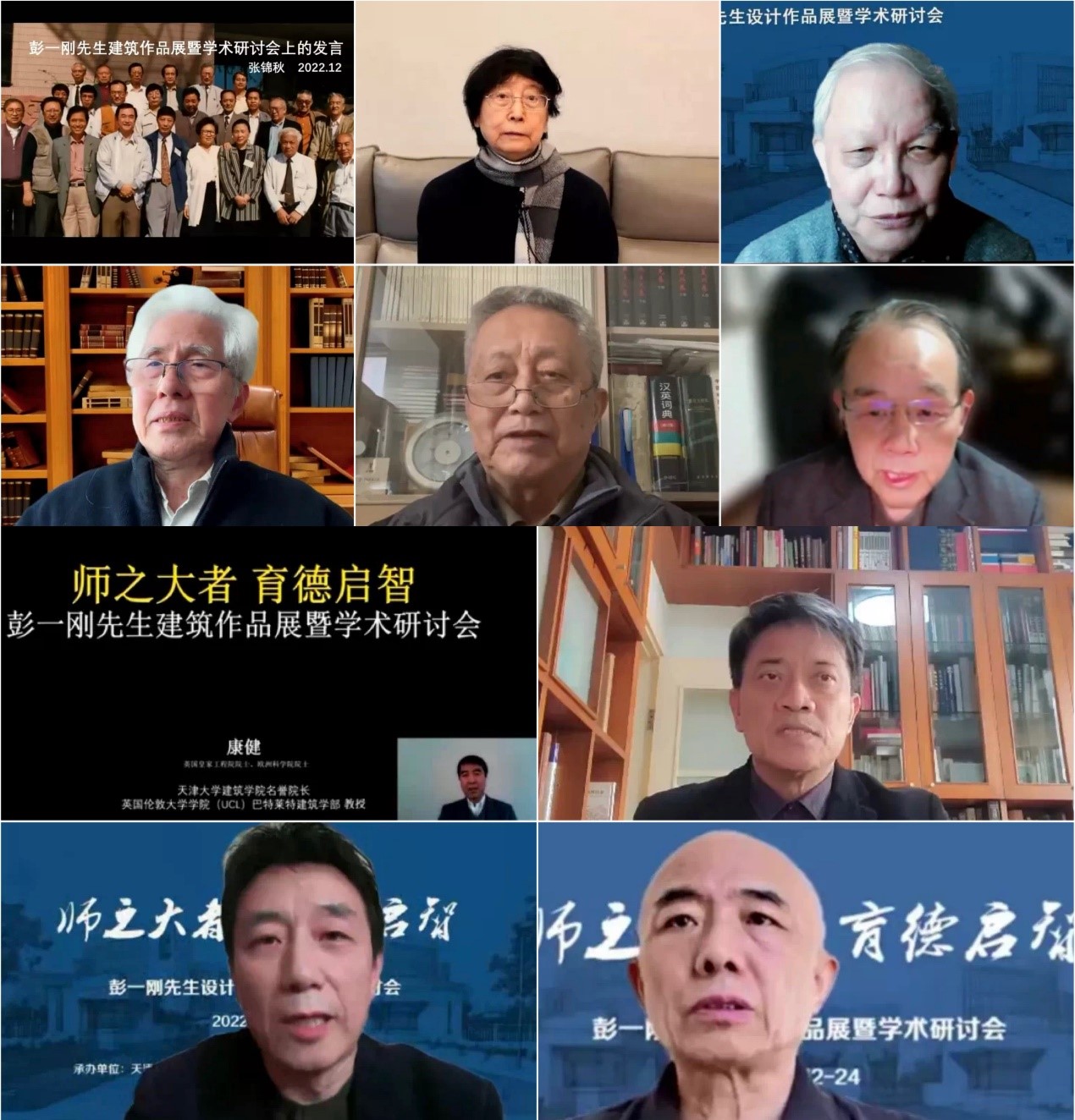 彭先生的同学、挚友、学生等多位嘉宾也先后发言。彭一刚先生的大学同学、清华大学建筑学院教授林贤光先生,彭一刚先生的同乡、挚友、中元国际工程设计研究院顾问总建筑师曹亮功先生,全国工程勘察设计大师、北京市建筑设计研究院有限公司顾问总建筑师柴裴义先生,67届校友、东南大学建筑学院教授朱光亚先生,67届校友、天津华汇工程建筑设计有限公司顾问总建筑师欧阳植先生,全国工程勘察设计大师、华东建筑设计研究院有限公司首席总建筑师、80级校友郭建祥先生,彭先生的忘年交、天津福莱特建筑工程有限公司董事长 李云飞 先生,天津大学建筑学院教授王其亨先生都送来了对彭先生的敬仰、怀念之情。彭先生的多位弟子,全国工程勘察设计大师、天津大学建筑学院教授、天津华汇工程建筑设计有限公司总建筑师周恺先生,全国工程勘察设计大师、中国建筑设计院有限公司总建筑师李兴钢先生,全国工程勘察设计大师、内蒙古工大建筑设计院董事长张鹏举先生,中国航空规划建设发展有限公司总建筑师傅绍辉先生,深圳开朴艺洲设计机构董事长蔡明先生,天津大学建筑学院教授徐苏斌老师,天津大学建筑学院教授曾坚老师都回忆了追随彭先生学习时的感人事例,呈现出彭先生作为“培养大师的大先生”的历历全景图卷。