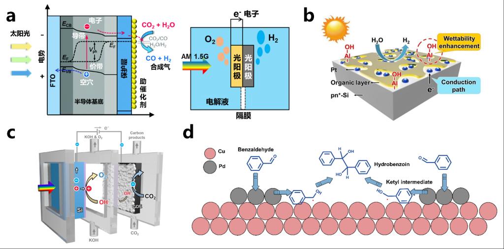 光电水分解制氢反应模拟了自然光合作用的光反应。为了避免电解液腐蚀,需要沉积保护层(图1a)。该团队设计并制备了一种非连续的疏水有机保护层(有机硅烷),这种疏水性的保护层具有不连续的孔,可以形成薄的气体层,从而将吸光基底与电解液分离,同时金属铂助催化剂仍可以与电解液进行接触。利用该电极,水分解制氢的电流密度达到了35 mA/cm2,光电反应稳定性超过了110小时(Nature Commun. 2022, 13, 4460,图1b)。相比于水分解制氢反应,(光)电催化二氧化碳过程,则是模拟了自然界中光合作用的暗反应,从而获得含碳化合物。通过保留C-O键,可以提高还原产物中含氧产物(如甲醇、乙醇等)的选择性。该团队提出了一种增强氧原子吸附的反应路径设计策略,促进了具有氧键合构型的甲酰基中间体(*OCHO*)的生成。结合高压反应器,最终在-1.1 V vs SHE(标准氢电极)的电势和4 MPa的反应压力条件下,实现了最高80.4%的甲醇法拉第效率(Nature Commun. 2022, 13, 7768)。然而,单独的电催化过程往往需要消耗较多的电能。引入光生电压,有望最终构建无偏压的“人工树叶”。该团队展示了一种用于二氧化碳还原的光电化学流动反应器,该反应器具有背照式硅基光阳极,其中系统的光生电压达到了0.7 V,大大减少了系统的外加偏压。在此基础上,利用阴极的银基催化剂,使系统的太阳能到一氧化碳化学能的转化效率达到了2.42%(Nature Commun. 2022, 13, 7111,图1c)。延长产物的碳链,获得高价值精细化学品、医药中间体,可以进一步提高人工光合成的经济性。该团队提出了一种具有可控钯位点比率的钯/铜催化剂来实现苯甲醛偶联反应。在−0.40 V vs. RHE(可逆氢电极)电势下实现了氢化安息香(可用于合成止痛药)的高效生成,产率为85.3%,反应速率达1.27 mmol/mg/h(Nature Commun. 2022, 13, 7909,图1d)。基于在光电化学储能领域的重要贡献,该团队受邀为Accounts of Materials Research撰写封面综述论文(doi: 10.1021/accountsmr.2c00175),系统阐述其研究范式。