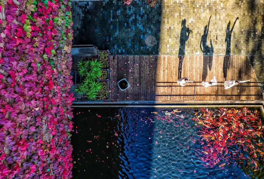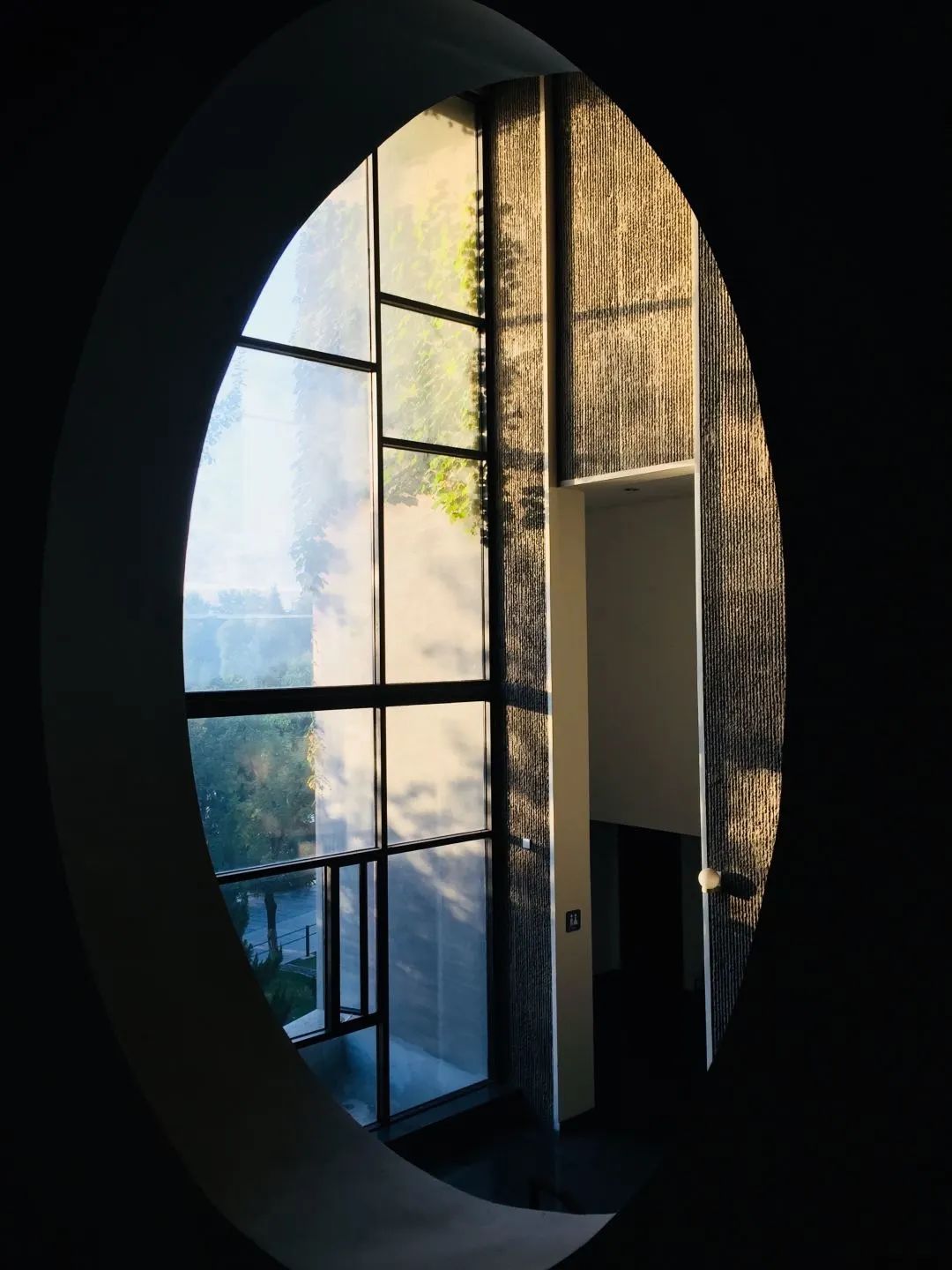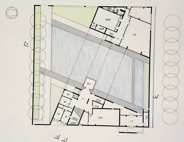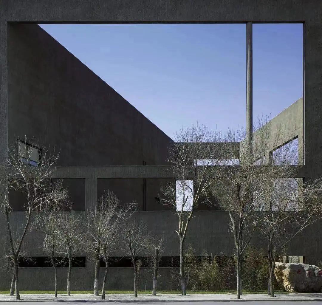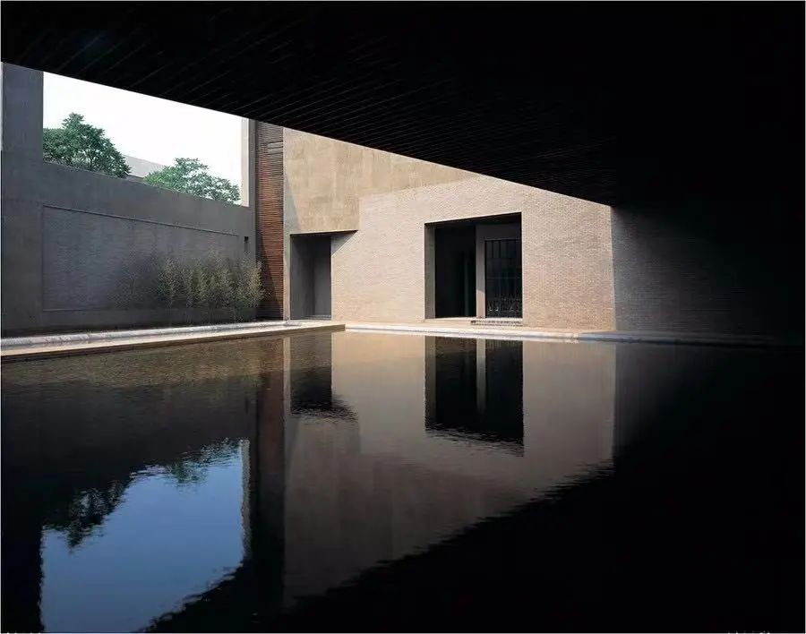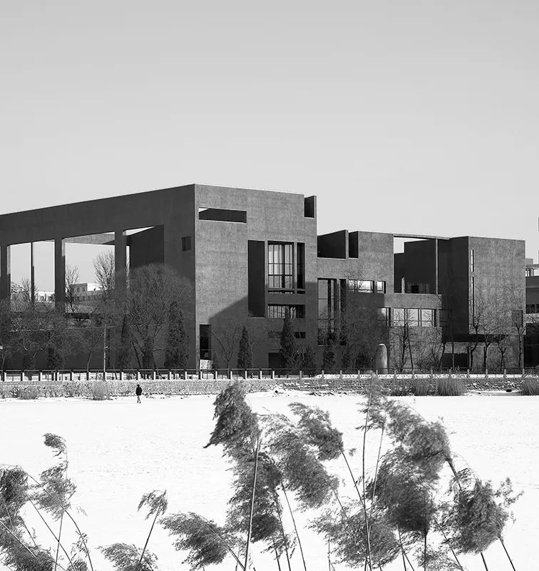 在冯研院的设计上,周恺先生赋予独特的匠心和天才的创造。高大的院墙合围出方形院落,院墙开出大小各异、形状不一的洞口,仿佛四时变幻的天空的画框。院中斜向架空的建筑体量将方形院落分成南北两个楔形院落,架空的楼体下方有一池粼粼浅水贯穿南北院落,这样的处理不仅保持院落之间视线上的贯通,也极大丰富了空间层次。建筑混凝墙面采用纵向切割、凿毛处理,具有斧凿粗粝的质感。庭院则以立瓦、青砖和木板漫地,质朴而清雅。加之楼内空间错落灵动,光线晦明变化,简约深遂,极具当代建筑的现代美,又富于空远静逸的东方书院的意境。