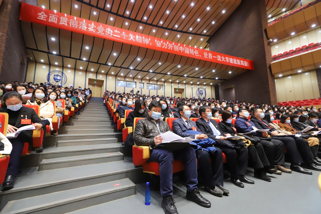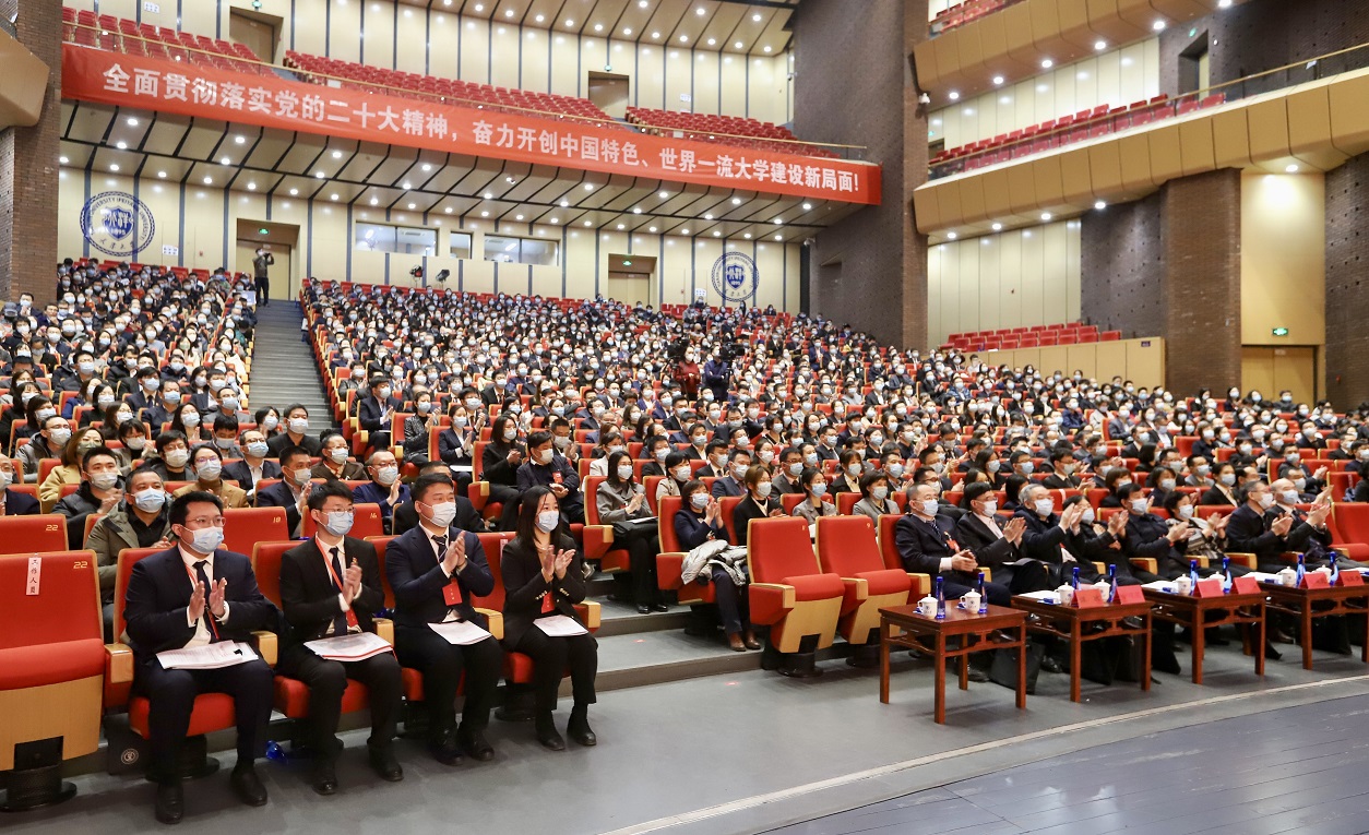 大会气氛庄重热烈,十面红旗分列两侧。会场悬挂着“全面贯彻落实党的二十大精神,奋力开创中国特色、世界一流大学建设新局面”横幅,催人奋进,鼓舞人心。