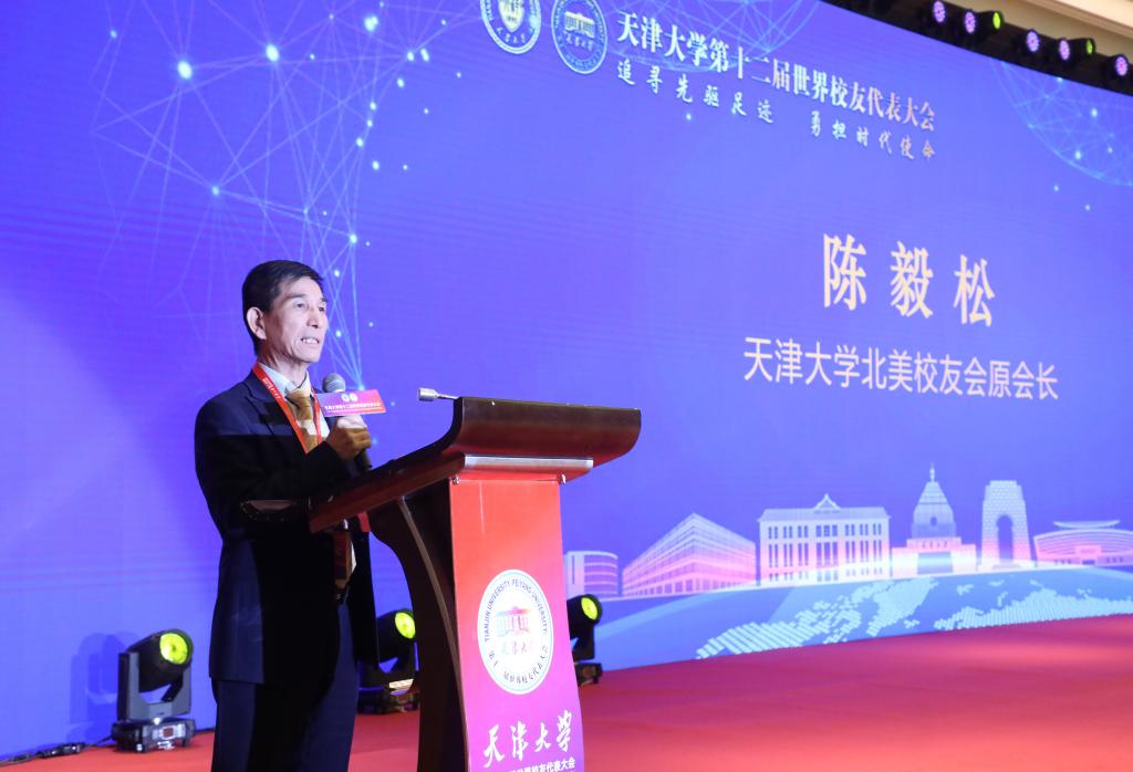 天津大学 1978 级自动化专业校友、天津大学北美校友会原会长陈毅松在致辞中指出:新时代新征程上,天津大学作为中国第一所现代大学,肩负着更加重要的使命,在世界一流大学建设的征途上任重道远。他希望母校密切注视科技前沿发展趋势,与时俱进,不断产生具有重大社会影响的创新性研究成果,将论文写在祖国大地上。