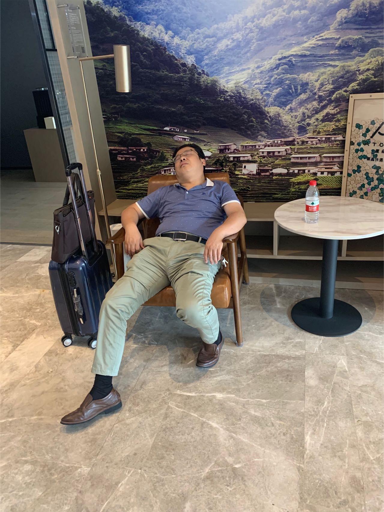 去年刚刚博士毕业的梁行手机里存着几张王老师生前珍贵的照片。一张是拍摄于2020年9月11日中午的照片。恰逢教师节期间,王老师带着课题组的几位学生去青岛出差,为了高铁行业材料准入标准设定与相关部门负责人开会讨论对接。结束了当天上午的讨论,就在梁行在前台办理退房手续的短短几分钟时间,他转身看到了已经仰在沙发上睡着了的王老师,并用手机拍下了这张照片。