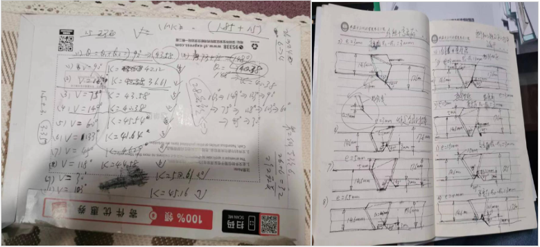 王东坡去世后,家人在整理他的书桌时,整理出来一摞厚厚的草稿纸,有随手演算的公式,也有满满一页页的草图,而这些“草稿纸”并不只是笔记本,许多都是随手拿到的纸张,比如多年前的两本硕士论文甚至几个快递封的背面都写满了他计算推演的过程。