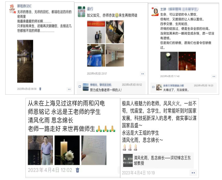 4月4日晚,团队的几位老师带着他的骨灰开车走过了他奋斗过的天津大学卫津路校区第1教学楼、第25教学楼,以及北洋园校区第31教学楼和他心心念念的工程中心。此时已是晚上23时,学生们在他途经的路上默哀告别。那个说起话来滔滔不绝、大嗓门的王东坡,那个仿佛永远充满热情、永远不知疲倦的王东坡这次是真的不会笑眯眯地推门就进了。