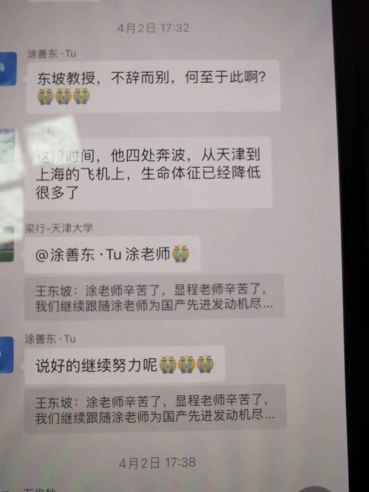 “王东坡教授理论联系实际,在焊接结构完整性领域做出了重要贡献,是我们学习的楷模。让我们共同缅怀他、向他致敬……”当天,参加完告别仪式的中国工程院院士、华东理工大学教授涂善东教授又一次哽咽。此前,在一个专项科研的工作微信群中,涂善东院士已忍不住痛心地留言“说好的继续努力呢?”并引用了王东坡3月22日的群发言“我们继续跟随涂老师为国产先进发动机尽绵薄之力”。而三个泪奔的表情是他最无奈的表达。在这个工作微信群此前非常热闹,是王东坡和几位同行最好的交流平台,最后的题目是关于“薄壁构件焊接质量精细化分级评价标准及其疲劳可靠性提高问题”, 这一细分领域急迫需要相关标准。
