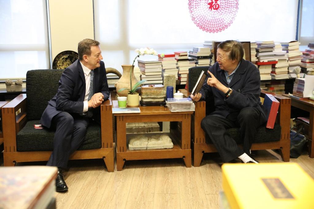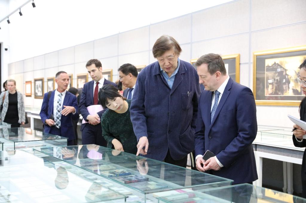 签约暨揭牌仪式后,巩金龙副校长陪同大使一行参观了冯骥才文学艺术研究院。大使与冯先生进一步交流遗产保护事宜,双方期待依托中心不断加强沟通,共同推动包括中法两国在内的文化遗产保护。