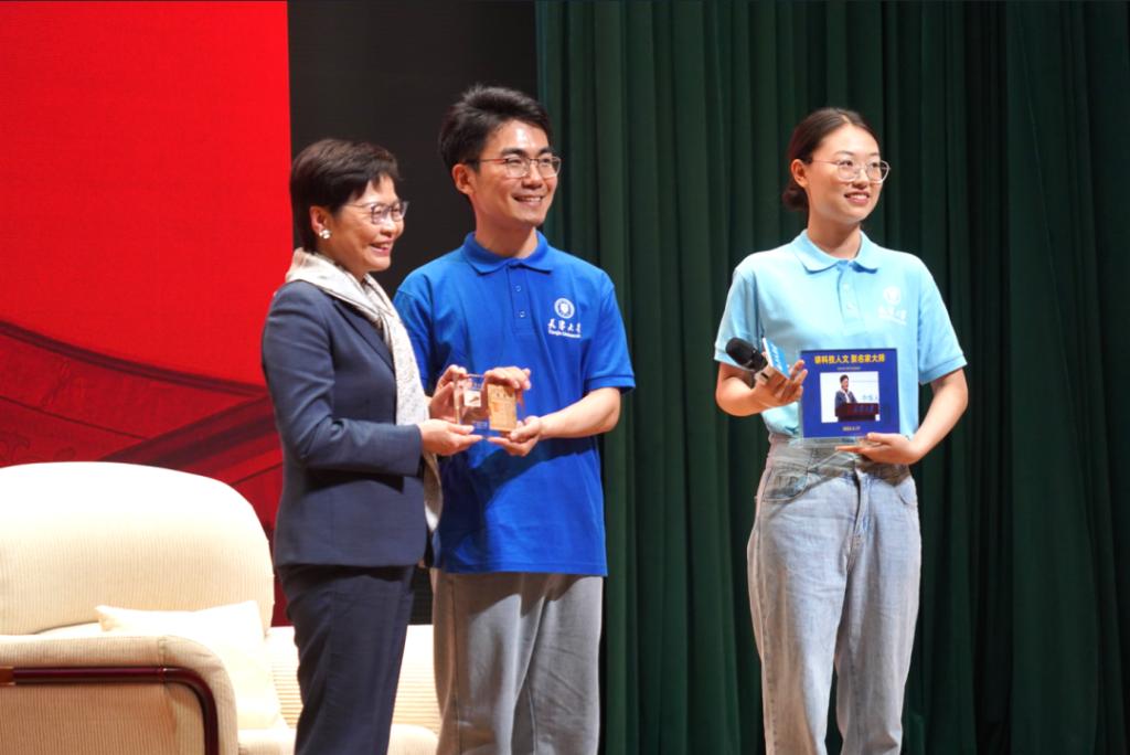林郑月娥女士从香港百年历史着手,回顾了香港的发展历程。她着重与同学们分享了香港自1997年7月1日回归祖国母亲怀抱以来所取得的丰硕建设成果和自己担任香港特别行政区行政长官的感受。她表示,香港在国家安全和选举制度的双重保障下,坚持“一国两制”正确轨道,她比任何时候都对香港更有信心、更肯定香港可以融入国家发展大局,在国家迈向第二个百年奋斗目标的进程中,发挥不可替代的作用。以“一国”为本、“一国”为根,以“爱国者治港”为原则,“两制”定会枝繁叶茂,香港这颗祖国的掌上明珠,必定可以焕发越来越迷人的光彩。