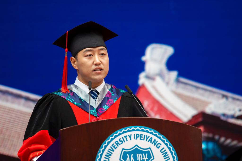理学院化学专业博士研究生李孟阳作为毕业生代表发言。通过回顾自己在天大五年的学习和生活,他更深刻地理解了天大人的家国情怀,理解了天大人勇于创新、不断挑战的追求,也践行着天大人要将祖国的需要作为自己的志愿的人生选择。在毕业择业之际,他在众多的高校、企业、科研院所中,选择了中国运载火箭技术研究院,将带着天大人的智慧和情怀去探索浩瀚宇宙。