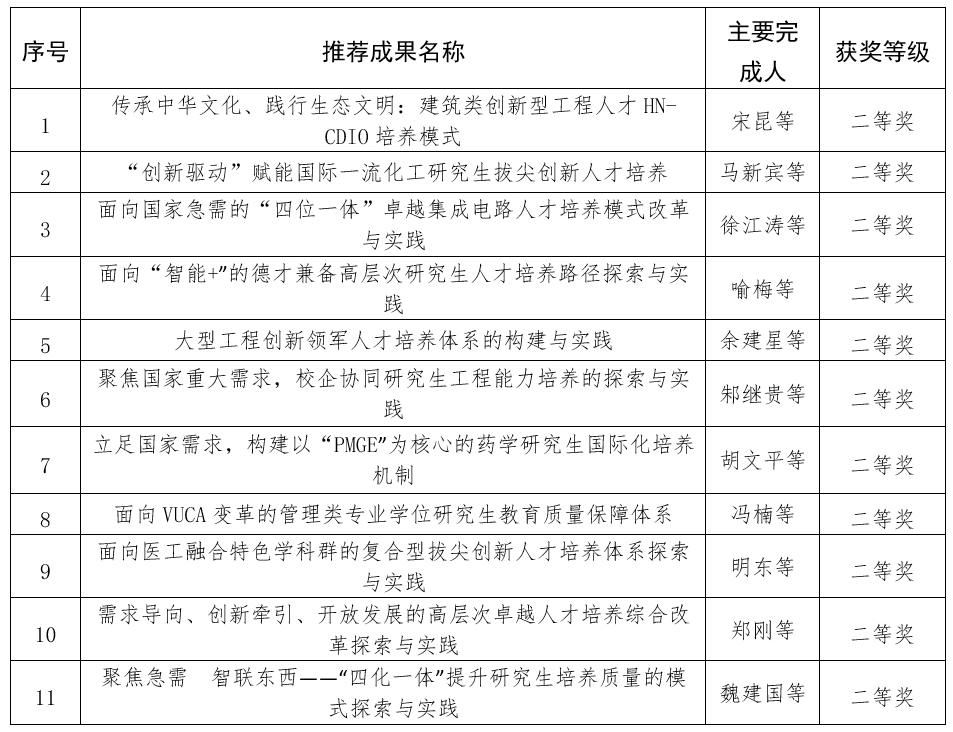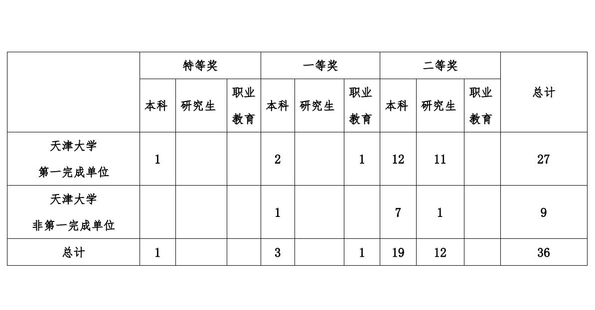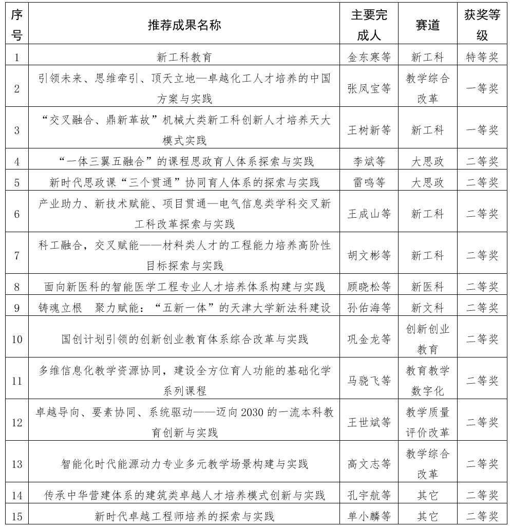 特等奖之外,《引领未来、思维牵引、顶天立地—卓越化工人才培养的中国方案与实践》和《“交叉融合、鼎新革故”机械大类新工科创新人才培养天大模式实践》2个项目获本科教学成果奖一等奖;《“一体三翼五融合”的课程思政育人体系探索与实践》等12个项目获本科教学成果奖二等奖;《传承中华文化、践行生态文明:建筑类创新型工程人才HN-CDIO培养模式》等11个项目获研究生教学成果奖二等奖。由天津大学牵头的《双链融通·标准引领·项目支撑:新一代信息技术领域高职人才培养实践创新》获职业教育国家级教学成果奖一等奖。