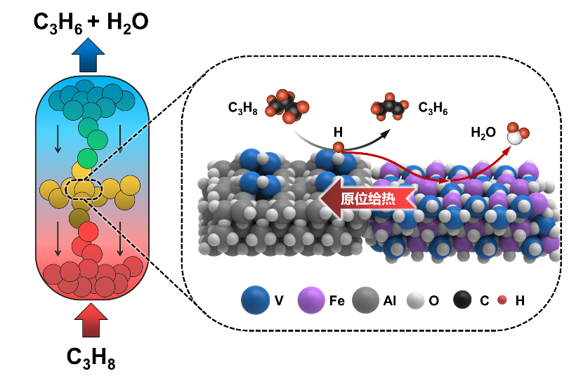 实现“双碳”战略目标对我国化工行业绿色低碳转型提出了重要要求。推动丙烯这一重要的化工基础原料的低碳化生产,具有十分重要的科学和战略意义。在丙烯生产工艺中,丙烷脱氢(Propane dehydrogenation)技术因其产品单一性好、经济性效益高、石油依赖性低等备受瞩目。然而,丙烷脱氢是热力学平衡受限的强吸热反应,需在较高温度下(>600 ℃)才能得到较高转化率,能耗和碳排放量高。因此,如何创新丙烯生产工艺,实现体系热量自给并突破热力学平衡限制,是提升丙烯生产能效的关键。