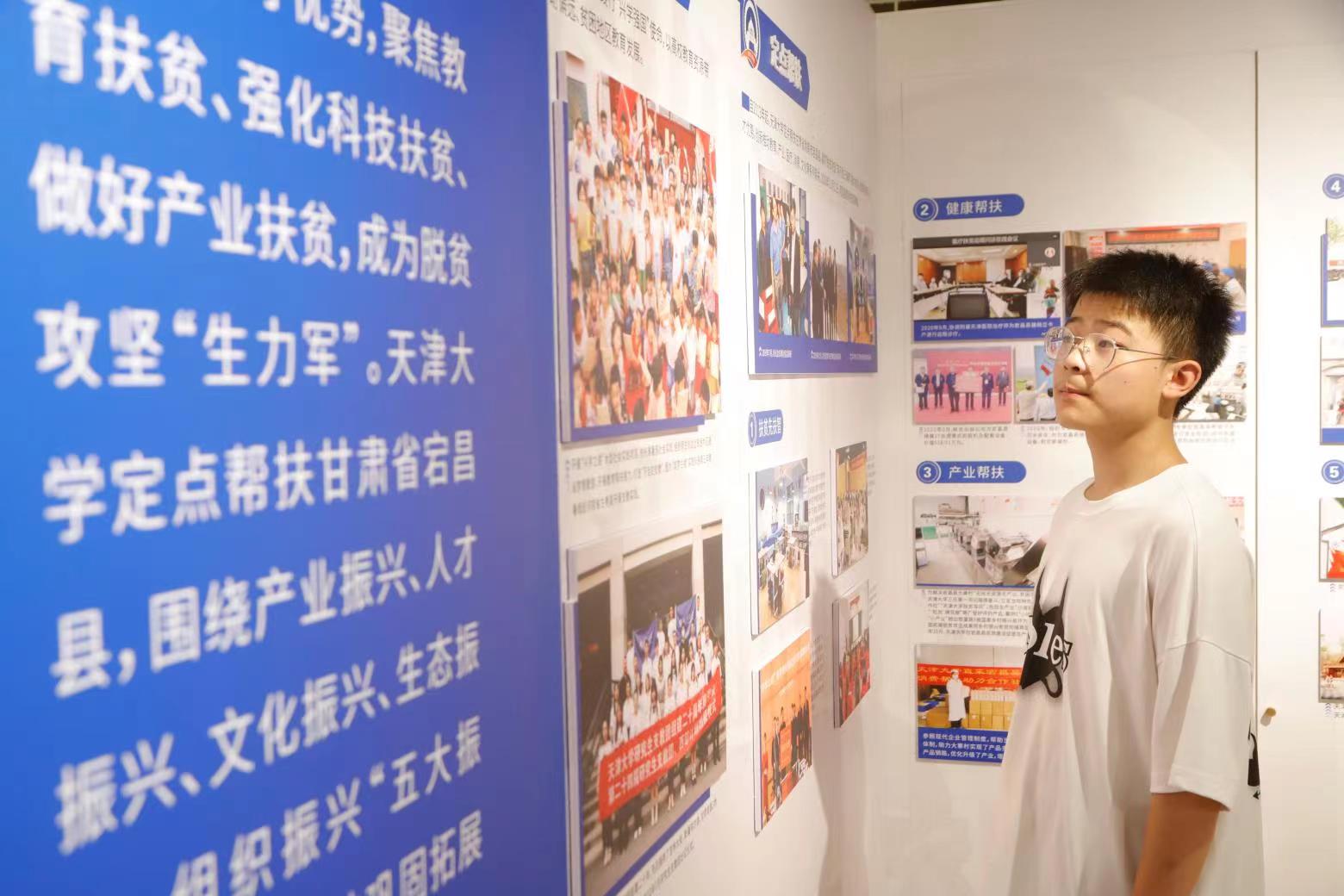天大有最美的图书馆。刚刚安顿好,小谢就迫不及待地打卡每所大学的灵魂建筑——图书馆。玻璃幕墙外树枝摇曳,阳光穿过白色百叶窗洒在木色的桌案上。透过建筑的浪漫和书本的厚重,那些奋笔疾书的同窗、角落里默默背书的少年、研究室侃侃而谈的团队、影音欣赏室内神采飞扬的主讲人,向每个新天大人宣告天津大学“严谨治学”的校风早已浸润在每一处角落,更浸润在每一个天大学子的内心深处。在这里小谢看到了天大这十年主题成果展, “脱贫攻坚这组专题照片太亲切了,这是我的家乡宕昌,这是天大支教团的老师,他教过我!”小谢指着照片兴奋地向同学介绍。