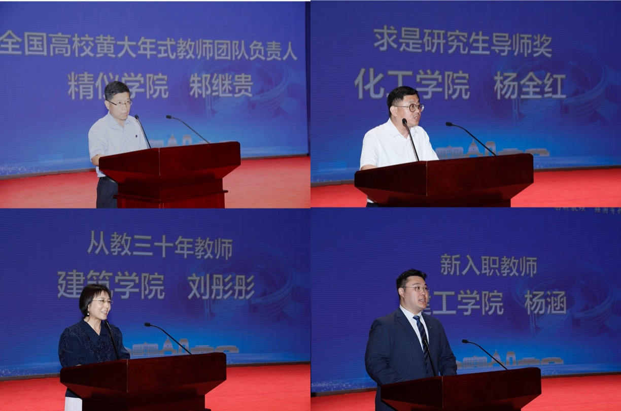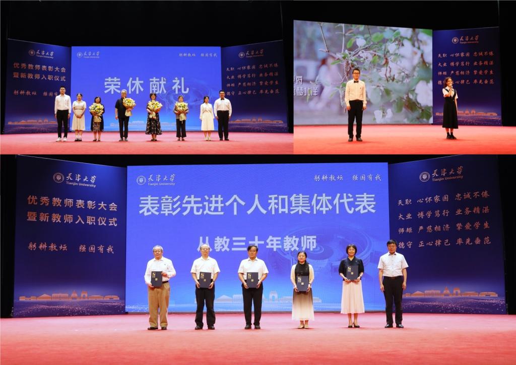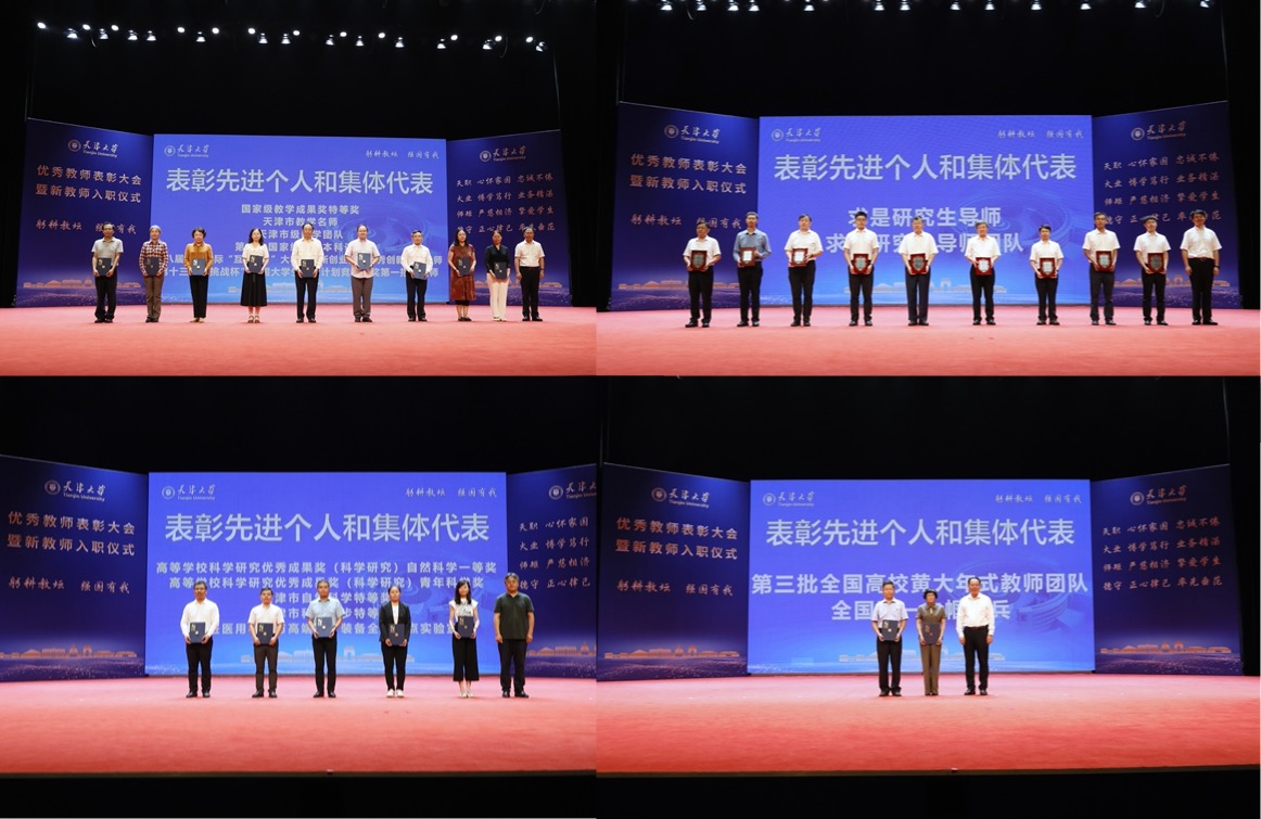 在荣誉表彰环节,国家级教学成果奖特等奖获奖教师、入选教育部第三批“全国高校黄大年式教师团队”负责人、“全国五一巾帼标兵”获得者、高等学校科学研究优秀成果奖(科学研究)自然科学一等奖获奖教师、高等学校科学研究优秀成果奖(科学研究)青年科学奖获奖教师、天津市教学名师代表、第八届中国国际“互联网+”大学生创新创业大赛优秀创新创业导师、求是研究生导师、求是研究生导师团队等受表彰的先进集体和先进个人代表先后上台领奖。