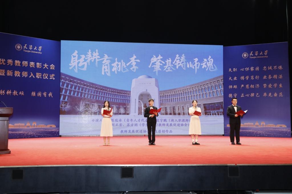 教书千秋伟业,育人万世丰功。为生动展现天大先生知重负重、履职尽责的家国情怀和师者担当,“教师发展促进协会”学生自行创作、并在现场与青年人才代表、新入职教师代表倾情演绎文艺作品——诗歌朗诵《躬耕育桃李 肇基铸师魂》,把感悟和敬意化在诗歌中,将大会氛围推向新的高潮,进一步激励全体教师择善而从、外塑师表、内铸师魂。