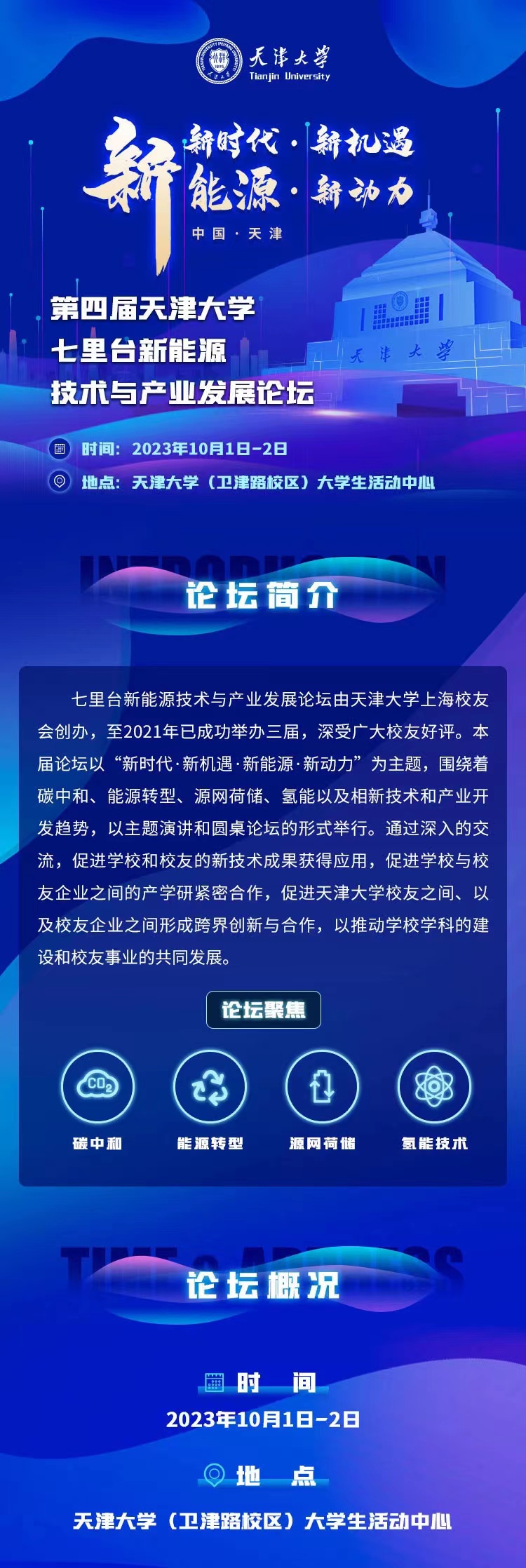天津大学七里台新能源技术与产业发展论坛2018年创立,已成功举办三届。本届论坛以“ 新时代· 新机遇· 新能源· 新动力”为主题,围绕着碳中和、能源转型、源网荷储、氢能以及相新技术和产业开发趋势,以主题演讲、圆桌论坛、自由交流等形式举行。论坛邀请了中国工程院院士王成山、中国科学院院士赵天寿、澳大利亚科学院院士乔世璋做主旨发言,他们分别带来了新型配电系统与电力储能、面向碳中和的储能技术、水分解制氢技术等方面的最新研究进展。业内知名专家学者、企业家也都在论坛上亮出了实验室最新研发成果,企业研发方向。论坛希望通过搭建跨界平台,深入交流,促进产学研紧密合作,形成跨界创新与合作,为实现“双碳”目标,服务能源强国建设贡献天大的力量。