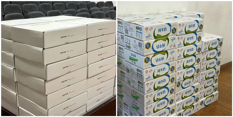 向52名经济最困难的本科生学弟学妹们每人捐赠一箱纯牛奶和一个暖手宝。这花了他7200多元,是他获得学校“自强之星”的奖学金。