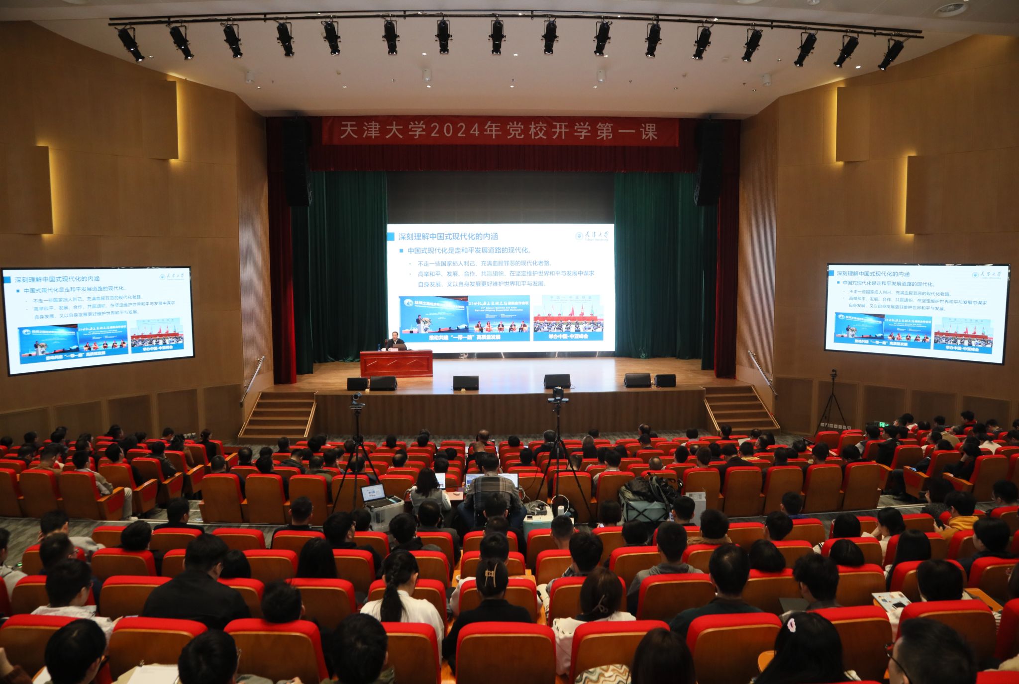 本站讯(记者刘晓艳 摄影郭程)2024年3月29日下午,天津大学2024年党校开学第一课暨师生党员全覆盖培训启动。此次面向全校师生党员开展全覆盖集中培训,是学校党委深入学习贯彻习近平新时代中国特色社会主义思想,巩固拓展主题教育成果,进一步完善师生党员教育培训体系,推动用党的创新理论统一思想、统一意志、统一行动的一项重要行动。校党委书记杨贤金讲授第一课,启动仪式由校党委副书记雷鸣主持。