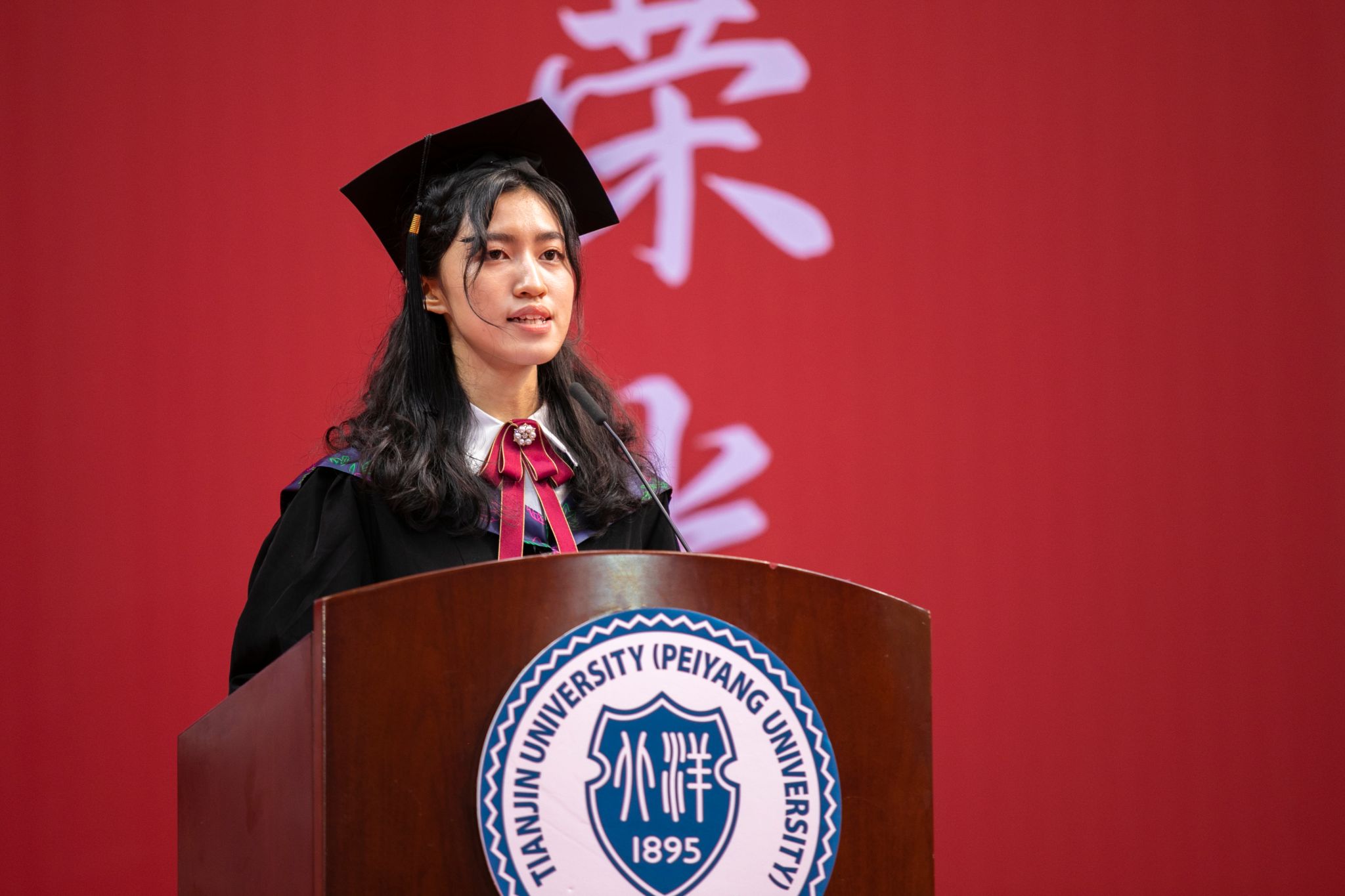 毕业典礼在全场师生庄严嘹亮的国歌声中拉开帷幕。教务处处长何芳宣读天津大学学位评定委员会关于授予学士学位的决定:经天津大学学位评定委员会审议,授予4680名本科毕业生学士学位,向圆满完成学业即将走上工作岗位和继续深造的同学们表示诚挚的祝贺。