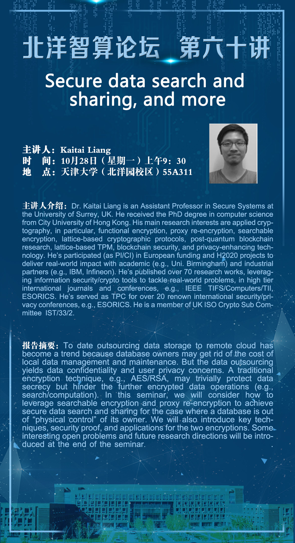 Dr. Kaitai Liang is an Assistant Professor in Secure Systems at the University of Surrey, UK. He received the PhD degree in computer science from City University of Hong Kong. His main research interests are applied cryptography, in particular, functional encryption, proxy re-encryption, searchable encryption, lattice-based cryptographic protocols, post-quantum blockchain research, lattice-based TPM, blockchain security, and privacy-enhancing technology. He’s participated (as PI/CI) in European funding and H2020 projects to deliver real-world impact with academic (e.g., Uni. Birmingham) and industrial partners (e.g., IBM, Infineon). He’s published over 70 research works, leveraging information security/crypto tools to tackle real-world problems, in high tier international journals and conferences, e.g., IEEE TIFS/Computers/TII, ESORICS. He’s served as TPC for over 20 renown international security/privacy conferences, e.g., ESORICS. He is a member of UK ISO Crypto Sub Committee IST/33/2.