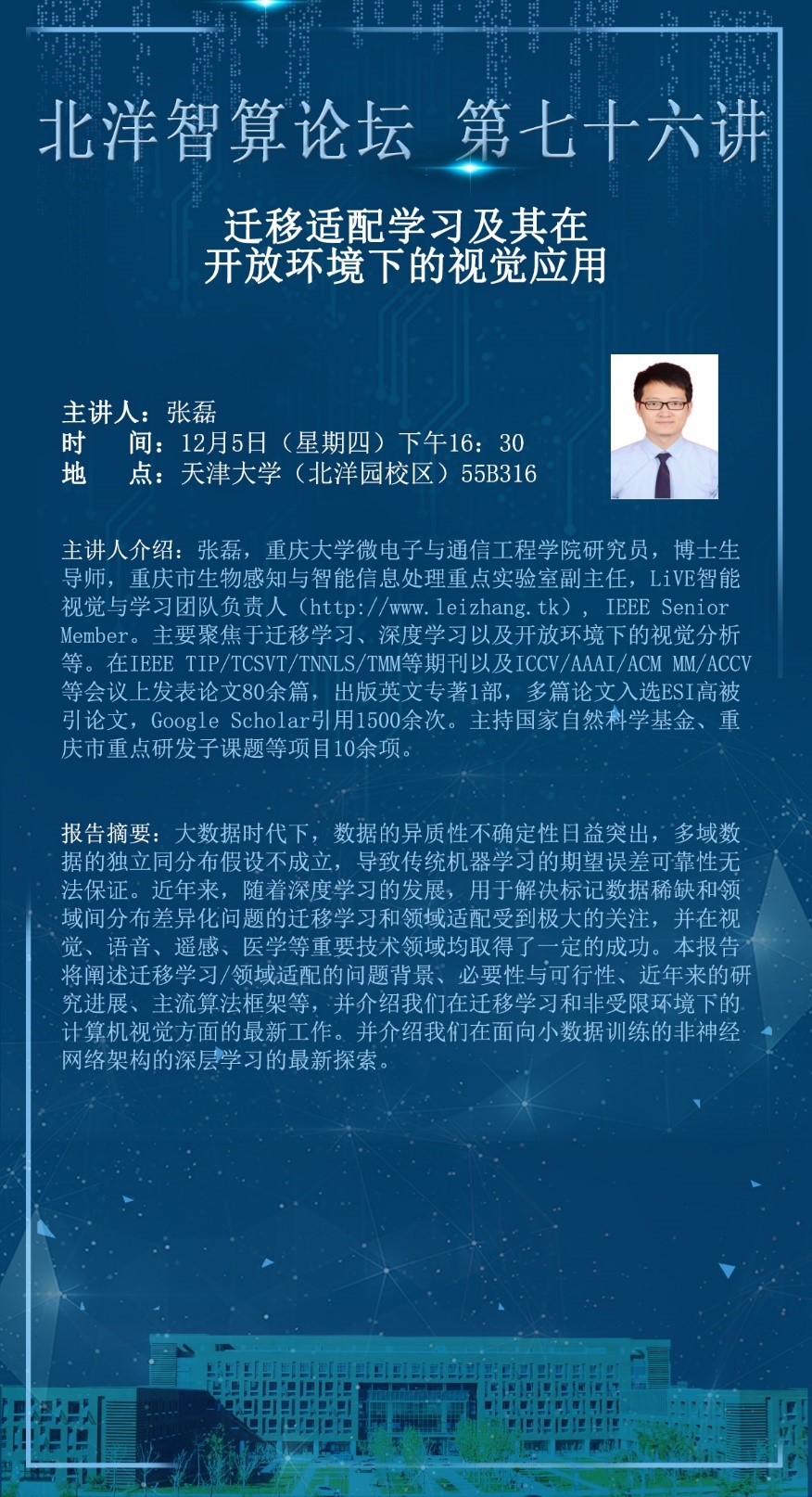 张磊,重庆大学微电子与通信工程学院研究员,博士生导师,重庆市生物感知与智能信息处理重点实验室副主任,LiVE智能视觉与学习团队负责人(http://www.leizhang.tk), IEEE Senior Member。主要聚焦于迁移学习、深度学习以及开放环境下的视觉分析等。在IEEE TIP/TCSVT/TNNLS/TMM等期刊以及ICCV/AAAI/ACM MM/ACCV等会议上发表论文80余篇,出版英文专著1部,多篇论文入选ESI高被引论文,Google Scholar引用1500余次。主持国家自然科学基金、重庆市重点研发子课题等项目10余项。