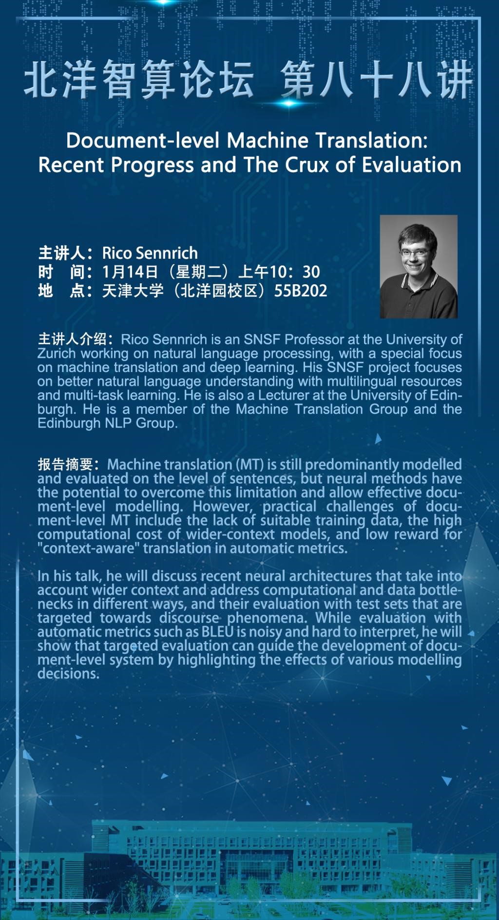 In his talk, he will discuss recent neural architectures that take into account wider context and address computational and data bottlenecks in different ways, and their evaluation with test sets that are targeted towards discourse phenomena. While evaluation with automatic metrics such as BLEU is noisy and hard to interpret, he will show that targeted evaluation can guide the development of document-level system by highlighting the effects of various modelling decisions.