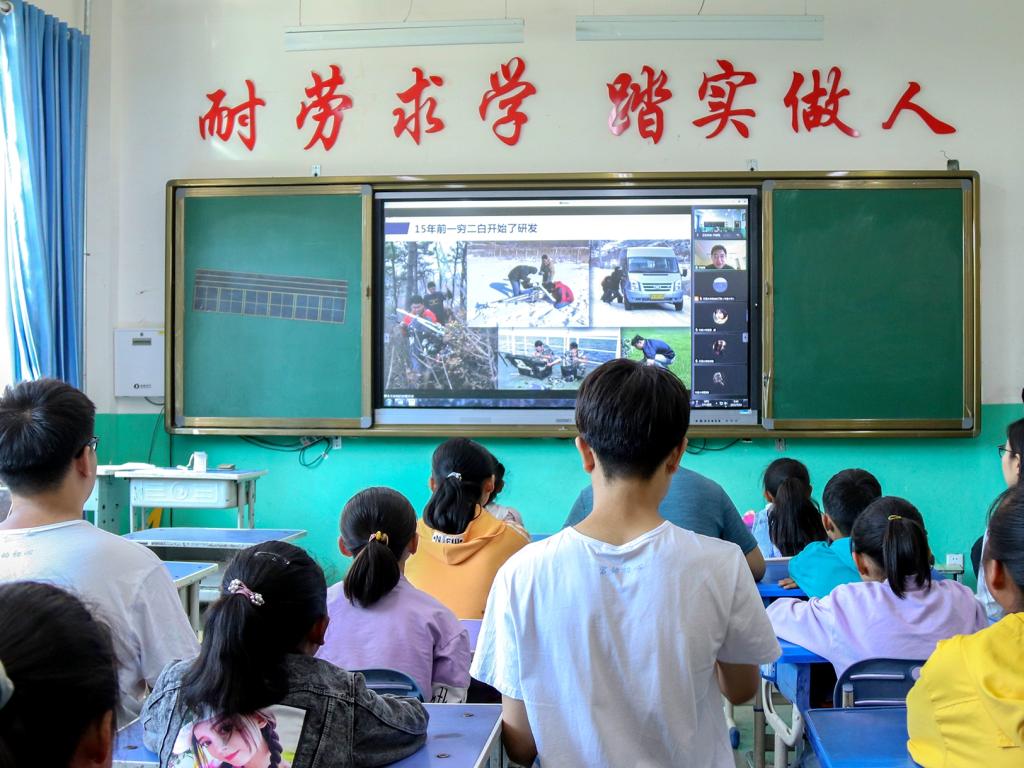 天津大学自动化学院“宕动初心”实践队还为宕昌当地的孩子们带来了一份特殊的礼物:他们邀请全国劳动模范,中国青年五四奖章获得者齐俊桐教授通过视频连线的方式讲授了一场精彩的“云课堂”:齐俊桐手拿无人机,面对着“千里之外”一双双好奇的大眼睛,深情讲述着他带领科研团队用自己研发的无人机参与地震救援,监控房屋损毁和救灾帐篷,为灾难搜救赢得了宝贵的时间的故事,鼓励孩子们努力学习,热爱科学,“要在心里种下一颗用科技创新报效国家的种子。”