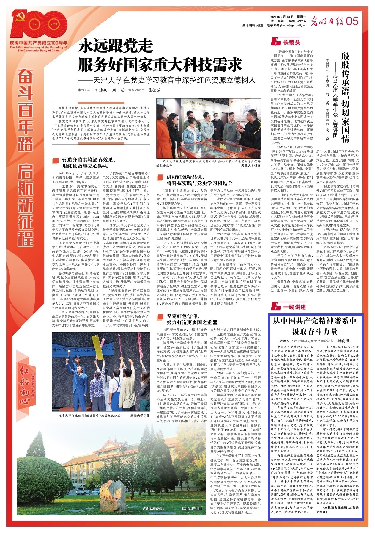 深入研究、领会中国共产党精神谱系的丰富内涵和时代价值,才能使理论宣讲更生动、更丰富、更深刻。4月,学校揭牌成立天津大学中国共产党精神谱系研究中心。研究中心成立后,已形成《在历史交汇点上》《从中国共产党人的精神谱系领悟党的百年历史》等专著、研究论文和理论文章系列成果,并举办了“中国共产党精神谱系”“弘扬伟大建党精神”等理论研讨会。研究中心还赴上海中共一大会址、浙江嘉兴南湖、河北西柏坡等地学习感悟,进一步凝聚了校内外开展中国共产党精神谱系研究力量,推动学术研究交流、理论宣讲走向深入。