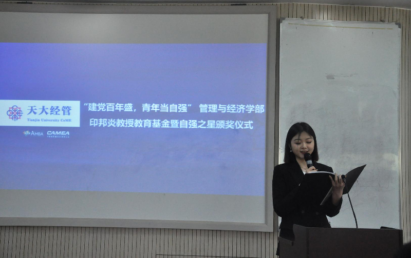 2021年4月16日,“建党百年盛,青年当自强”印邦炎教授教育基金暨自强之星颁奖仪式成功举办。印邦炎教授家属代表长子查京民老师、孙女印智扬,经管学部党委副书记袁婷、李庚,校友事务与发展办公室、学生工作办公室相关老师出席本次颁奖仪式。活动由2017级工商管理专业朱倍主持。